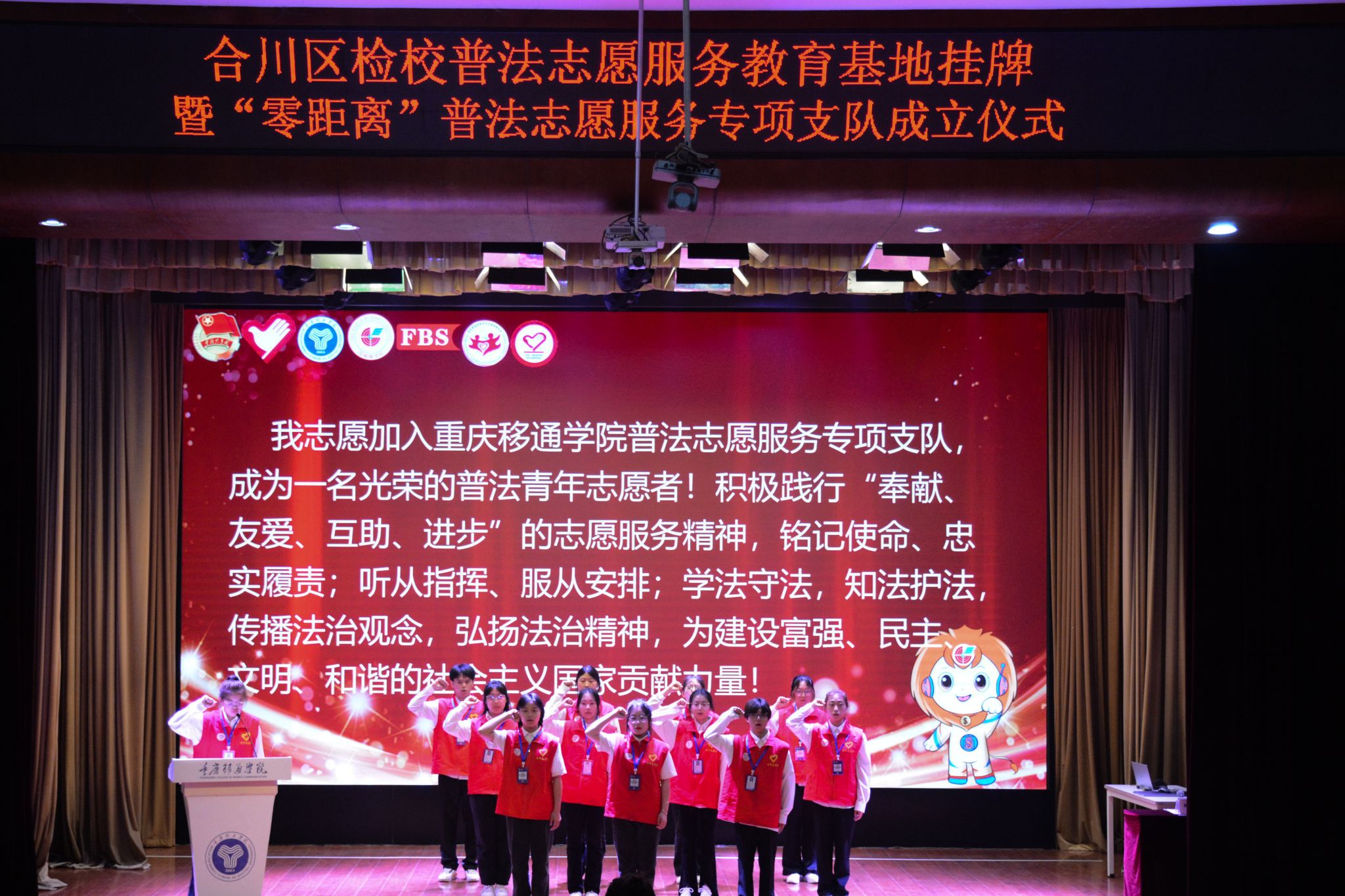 本次挂牌我校的是普法志愿服务阵地,是合川区内首个高校普法教育实践基地。同时,我校“零距离”普法志愿服务专项支队,也是合川区首个由检察院和高校青年志愿者组成的普法教育专项支队。