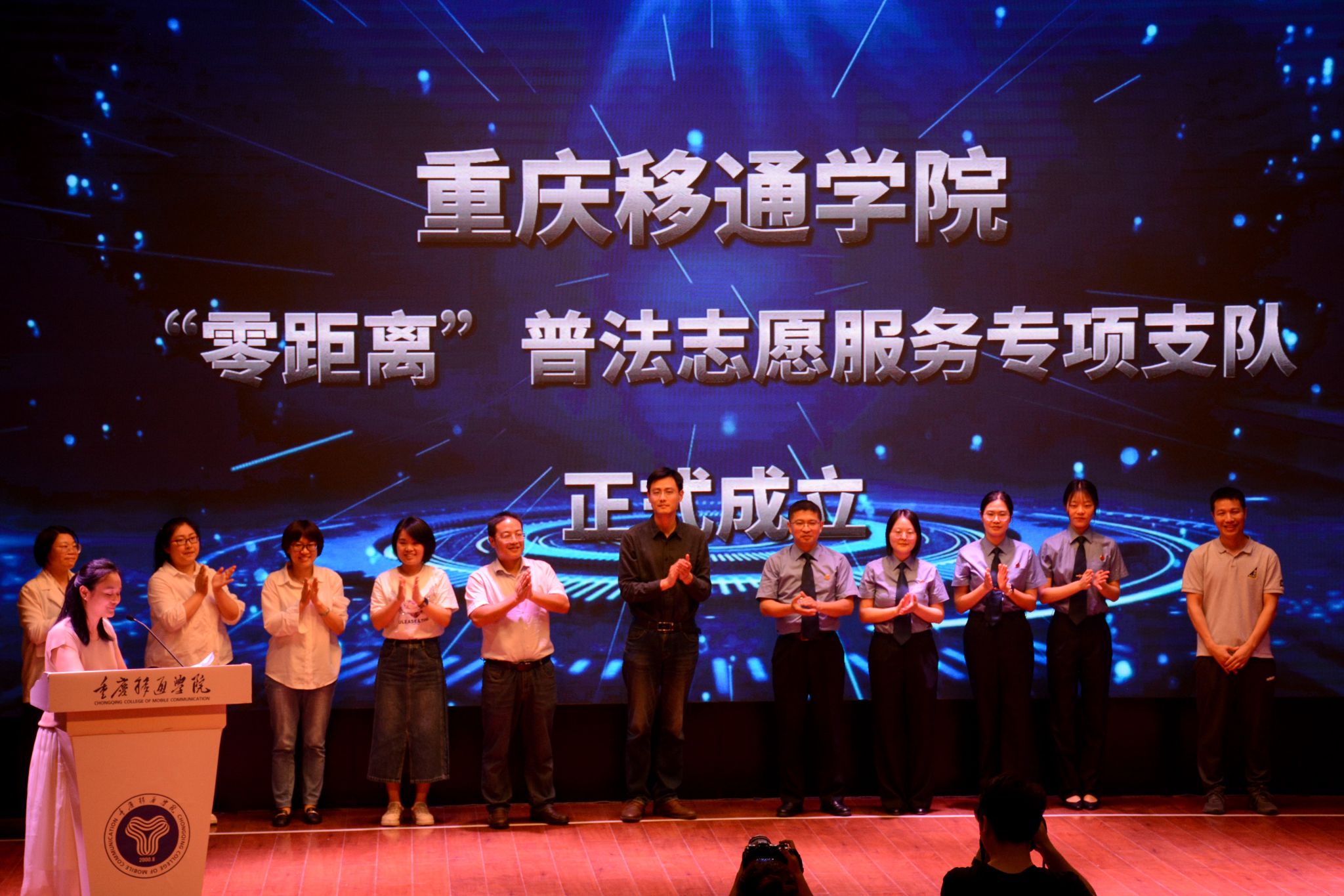 2023年5月19日合川区校检普法志愿服务教育基地挂牌暨“零距离”普法志愿服务专项支队成立仪式在下里巴人剧场举行,合川区检察院主任范小华,副主任梁丽莉,重庆移通学院党委副书记、副校长周伟,党委委员、纪委书记、校长助理尹浩亮,团委书记谢银平,学生处处长陈帅,淬炼·国际商学院副院长曾璐、刘薇唯,以及重庆市合川区检察院干警、校院两级志愿服务相关老师出席仪式。
