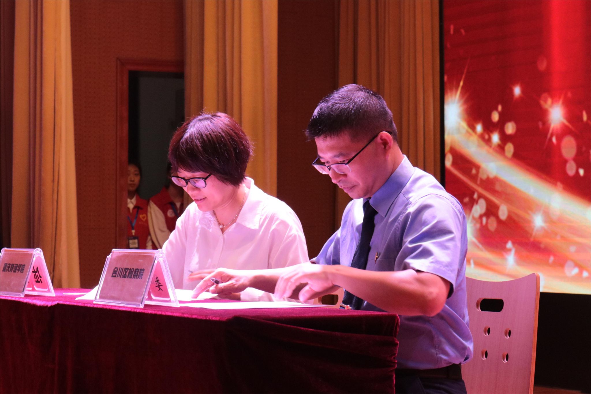 合川区检察院范小华主任与淬炼·国际商学院副院长曾璐签订项目共建协议,并与重庆移通学院党委副书记、副校长周伟共同揭牌合川区首个检校普法教育基地。