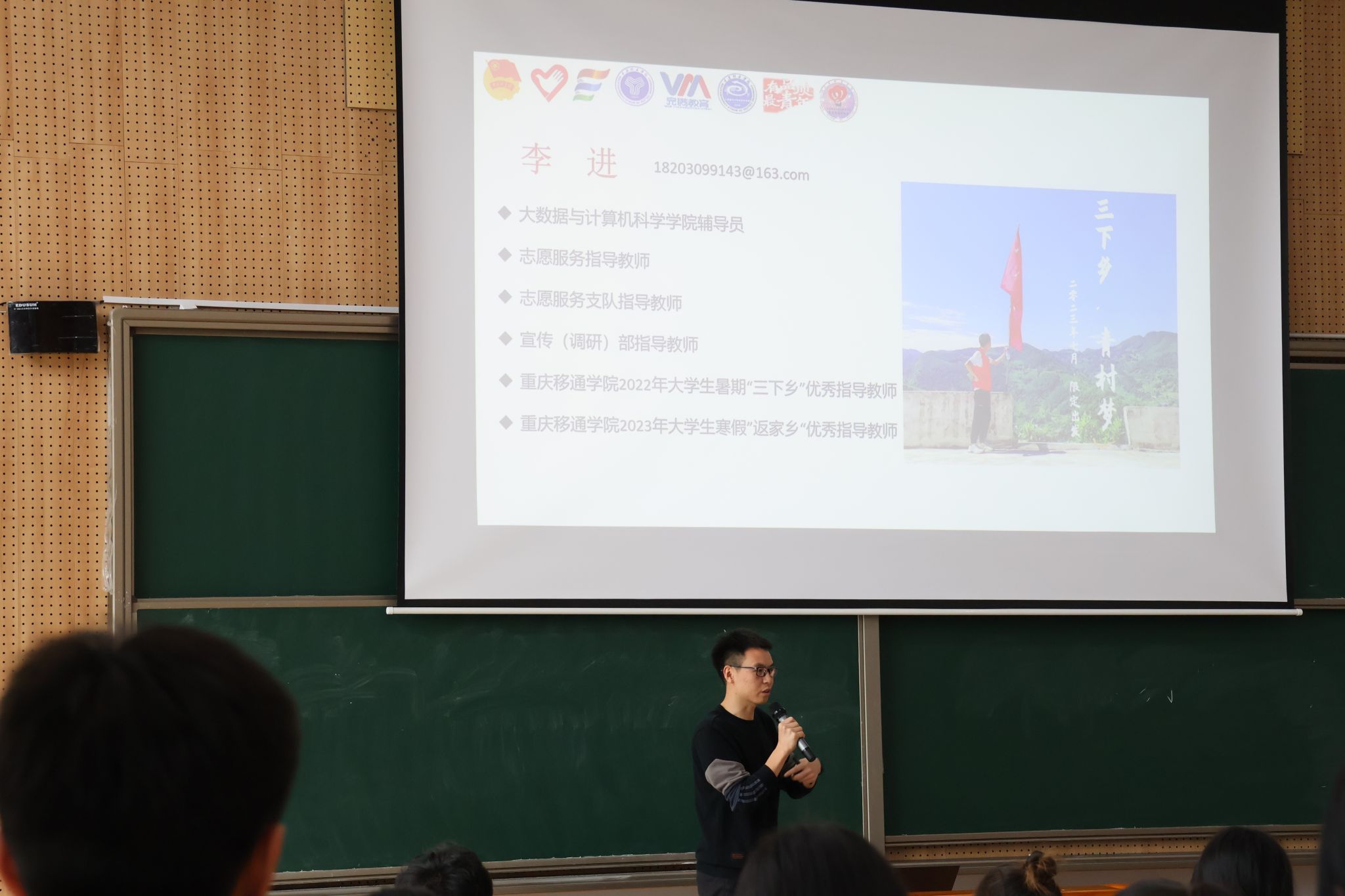 为引导和帮助广大移通志愿者,确立明确的目标并做好三下乡前期筹备工作,青年志愿者联合会在横山书院阶梯教室开展了三下乡系列宣讲第三讲:精准调研,立足资源禀赋,找准“三下乡”工作抓手。本次活动特邀请了大数据与计算机科学学院青年志愿者协会的指导老师李进,他曾获得2022年大学生暑期“三下乡”社会实践活动和2022年大学生寒假“返家乡”社会实践活动的优秀指导老师称号,本次三下乡系列培训从如何进行大学生暑期“三下乡”资源取向入手。