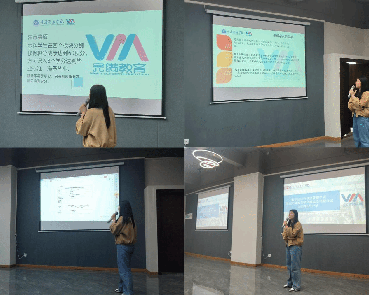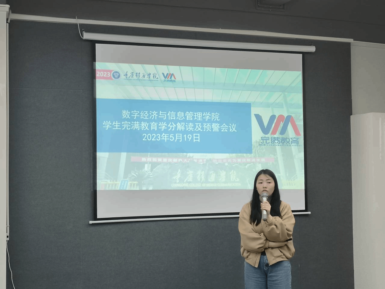 根据社会对人才使用的现实需求,培养学生饱满的全面发展人格开展的一项重要工作。为让更多同学具体了解完满教育学分及完满教育学分认定工作,解决大部分同学对学分修读得问题,数字经济与信息管理学院于5月19日下午4点在南湖声影活动室开展2022-2023学年完满教育学分解读及预警会议,本次会议有幸邀请到数字经济与信息管理学院悠学派负责老师王瑞老师就完满教育学分作细致讲解。学院2022级专升本辅导员张雪老师、合川校区各班班长和团支书参会。