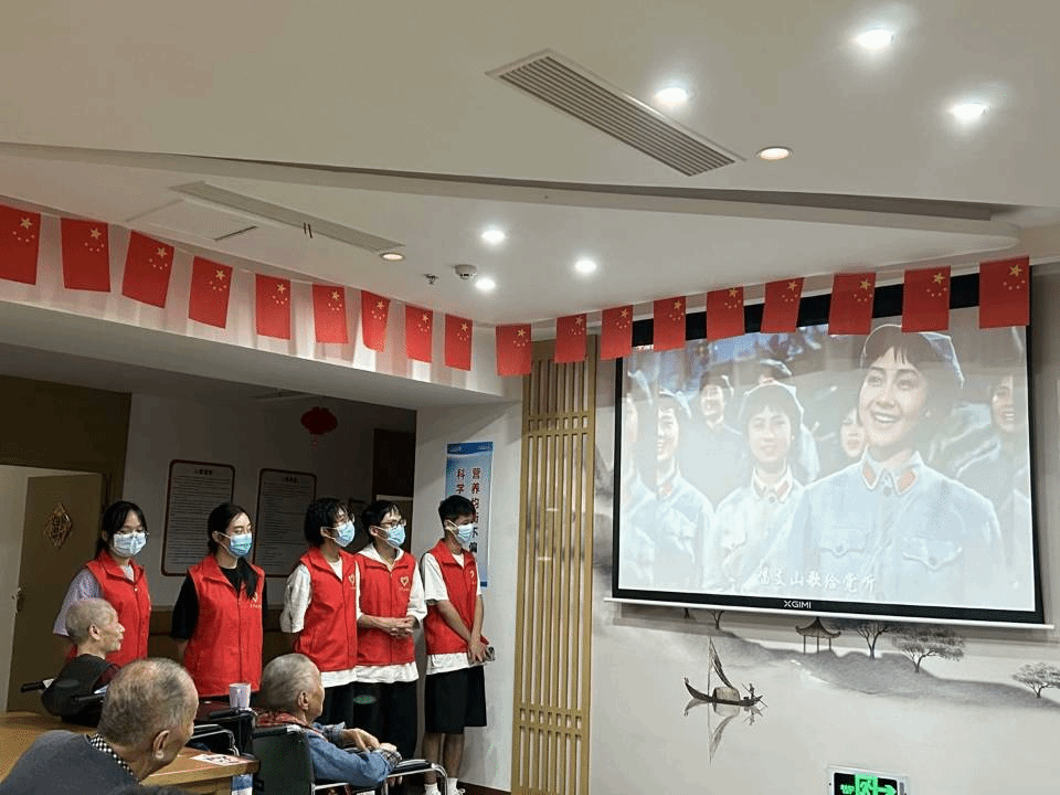 支队队长带领志愿者献上一曲《外婆的澎湖湾》。曲调优美抒情,以充满激情的抒怀表达了对美丽的奶奶们和可爱的爷爷们的赞美和关心之情。熟悉的歌词不仅缩短了志愿者与爷爷奶奶的距离,还勾起了两代人的回忆。