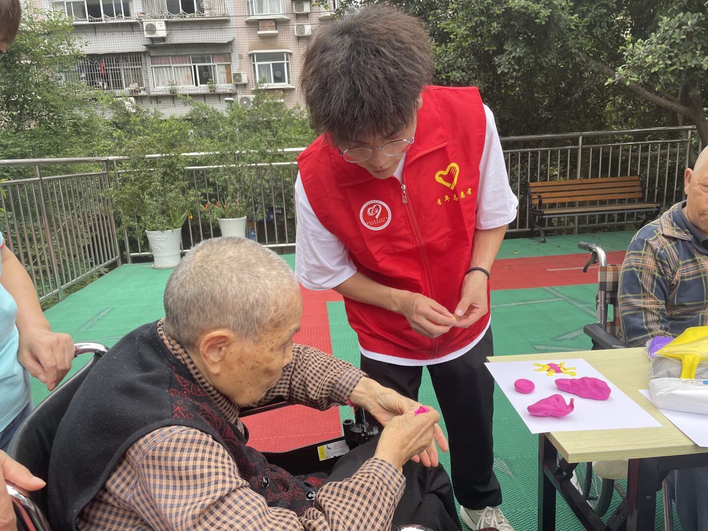 志愿者为老人带去了手工黏土,让老人们重拾回忆,把老人的手调动起来以及让志愿者们与老人们进行剪纸比赛,让老人们在久别重逢时再次体验一把活力的感觉。比起以往安静的养老院,现在的养老院既热闹又欢乐,养老院里还洋溢着志愿者与老人们灿烂的笑容,时间仿佛定格在了这一和谐的画面。这两个活动结束后,志愿者们开始给老人按摩,再按摩过程中聆听他们的故事,从年长者那里学到一些生活态度。之后就是“大合唱”,由所有志愿者一起合唱《强军战歌》,仅仅在这几分钟的时间里,志愿者用自己的歌声为老人们传递往事,一些老人会打着拍子,与志愿者一起唱。这次合唱赢得了老人们的掌声,也得到了老人们的热情回应。志愿者们不仅为老人们带去了欢乐,同时自身也感到了骄傲与自豪。