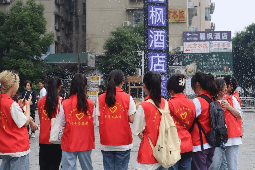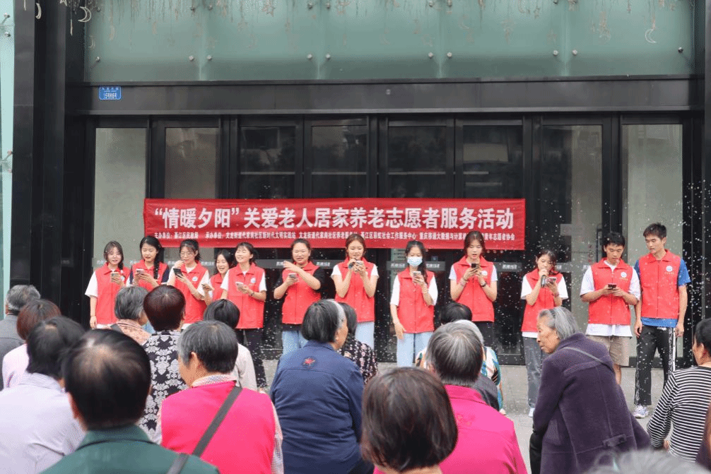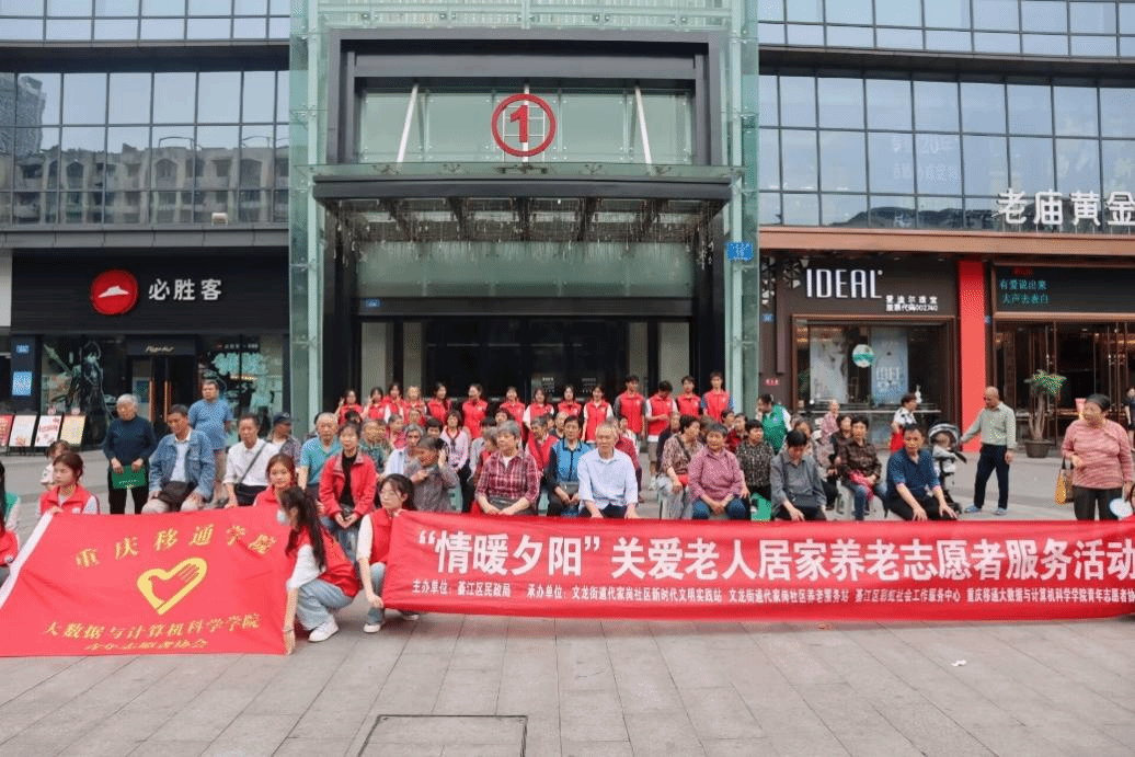 本期关爱老人活动得到了2022级数字媒体技术七班团支部和学院学生会部门甲骨文艺术团的大力支持。刚下过雨的空气清甜湿润,同着微微清风,志愿者们在学校门口集合完毕后,便前往了服务地点代家岗。抵达后,在工作人员们的指引下,一起来到了名扬国际广场,志愿者们与工作人员们一同摆好凳子,贴好横幅,做好一切活动前的准备工作。