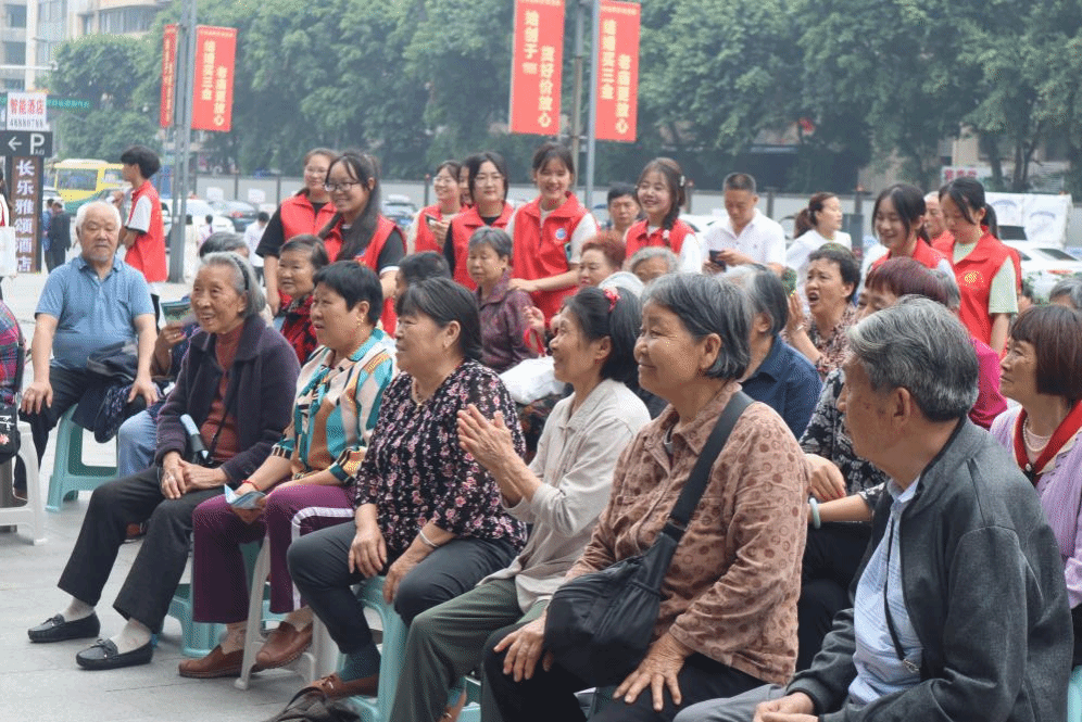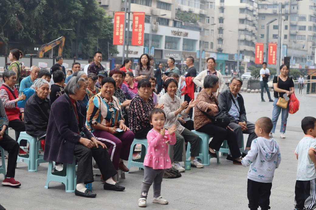 在志愿者们与老人们温馨的交流时,舞台上精彩的活动也拉开序幕。主持人用重庆话青春激昂的说着开场词,亲切的方言极大的拉进了志愿者与老人们之间的距离。叫好声响彻整个广场,也吸引来了更多的群众驻足观看,现场的观众不仅有老人和小孩,还有中年人和刚放学的中学生,一同欣赏这场热情澎湃的表演。
