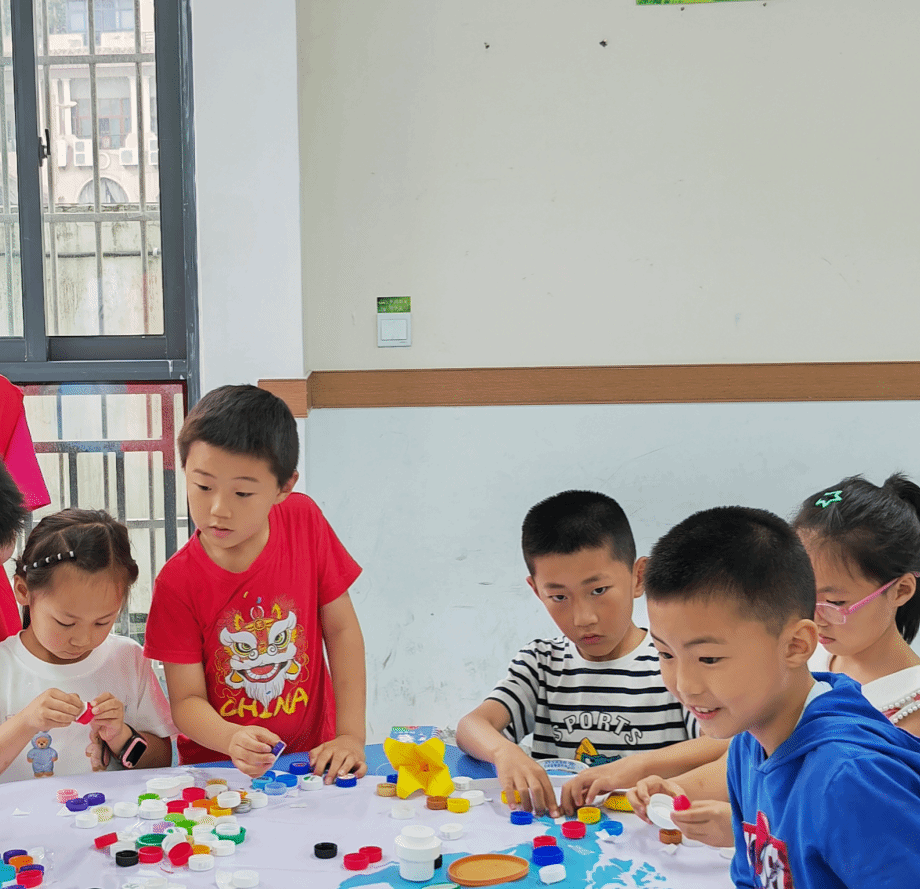 志愿者们把收集到的废旧瓶盖分发到每一个小组,大家一起用各种颜色的瓶盖粘贴在画布上绘制出地球的图案,志愿者们协助小朋友一起粘贴,不一会,一幅美丽的图案就出现了,这是大家共同努力的结果。