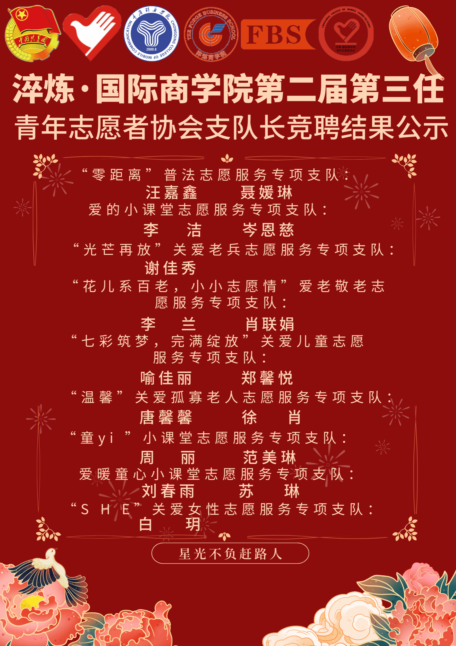 长达两个小时的支队长面试到此圆满结束。希望入选的支队长们都能够将“奉献,有爱,互助,进步”的志愿服务精神落实进以后的志愿服务活动中,保持自己的初心。本次支队长面试也让淬炼·国际商学院青年志愿者协会增添了一批新鲜血液,为接下来志愿服务活动的开展奠定了基础,期待志愿红的新篇章!