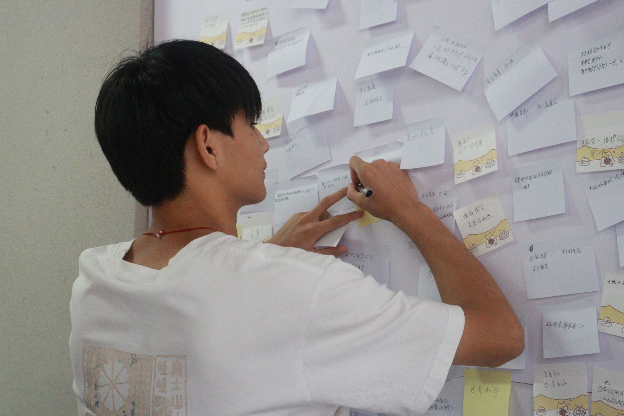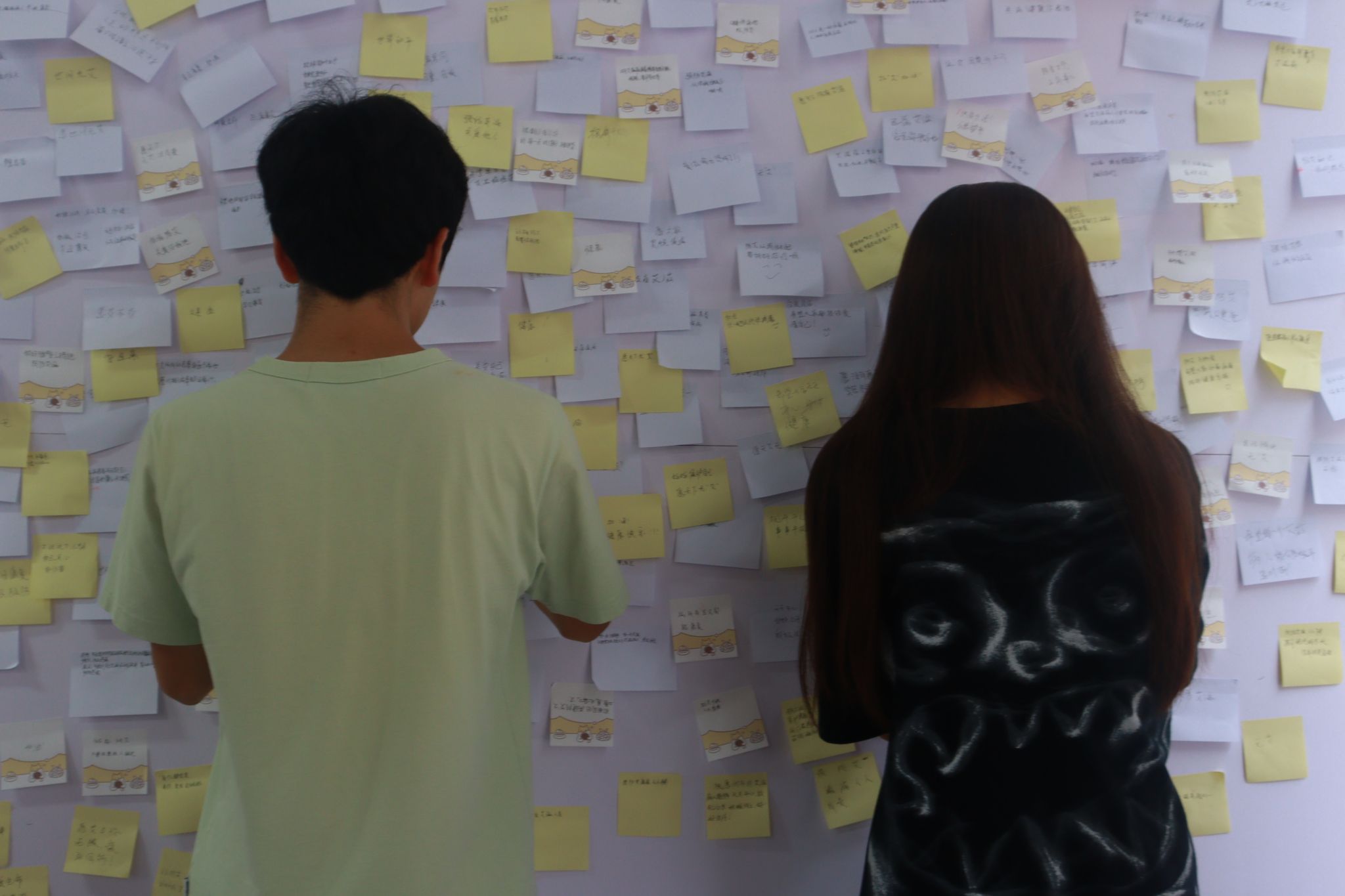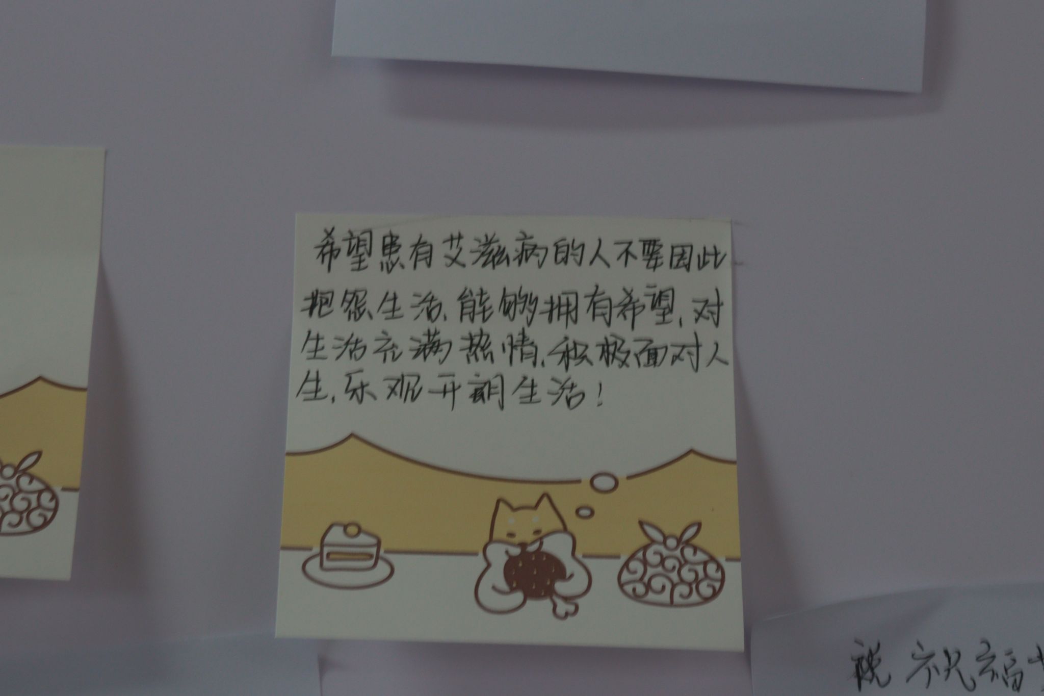 在拥抱后,参与的同学们来到活动第二个区域——“艾”的便利贴。小小便利贴,写上了同学们对艾滋病防治的认识和看法,留下了同学们对艾滋病患者的祝福和关心及想对他们说的话,通过文字传达着他们的爱心和想法。满满的便利贴墙,是同学们的爱,是艾滋病防治行动中的靓丽风景。