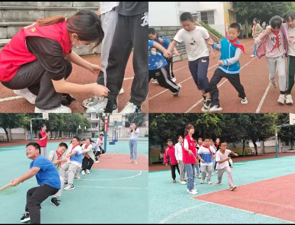 借助趣味运动会的形式,小朋友们进行了“趣味拔河”、“两人三足”、“接力往返跑”三个比赛。帮助了4、5、6年级的学生释放压力,解放了他们的天性,放空自己,收获跨越年龄的友谊,也为了让他们体会到竞争的乐趣,敢于面对失败的挫折,悦纳自己,接受自己。在比赛中,老师和志愿者们通过引导孩子们的情绪、鼓励孩子们的表现等方法,来解决他们在比赛中遇到的问题。例如,在一项团体接力赛中,有个小朋友因为害怕掉落而犹豫不决,志愿者们便耐心地引导他放松心态、信心满满地跨过障碍,最终成功完成了比赛。运动场上的小朋友们,奋勇争先,百舸争流,赛场上的他们厚积薄发,满腔热血志在远方,韶华潋滟溢四方。