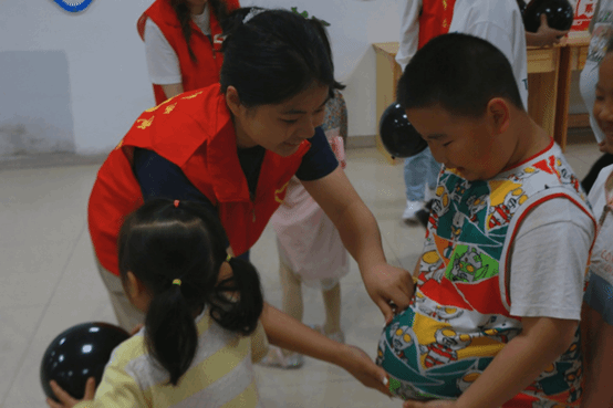 (志愿者带领小朋友体验“怀孕”)