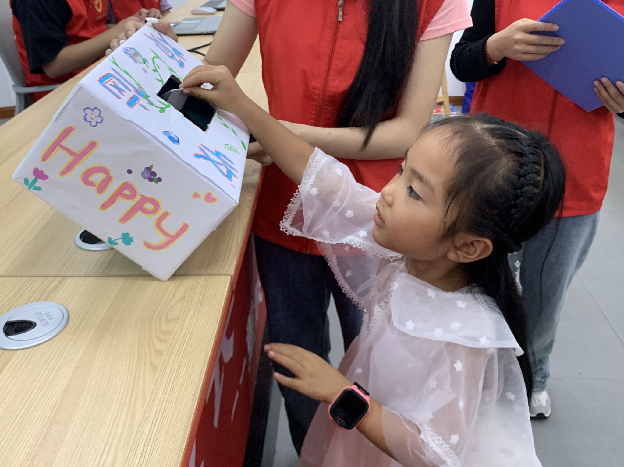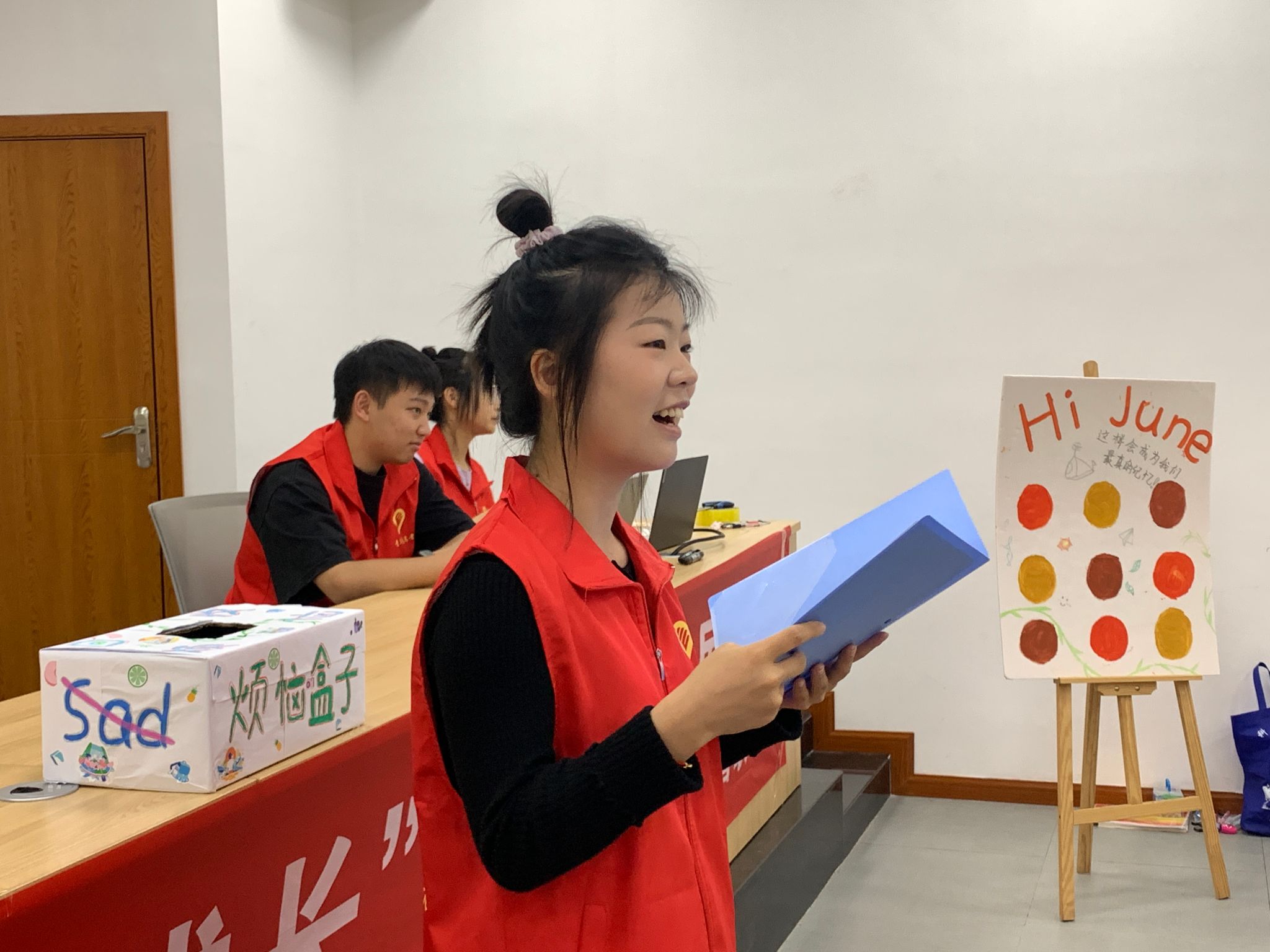 情绪是人心理活动的重要表现,是人对客观事物的态度体验及相应的行为反应。为帮助小朋友们摆脱负面情绪带来的困扰,志愿者们通过“烦恼盒子”情绪碎纸机、“宽容之花”心理舒缓小游戏、“雨点变奏曲”反应力小考验三个环节帮助儿童正确认识情绪。小朋友们以小纸条的形式写下自己的烦恼,由志愿者们在现场进行答疑解惑,帮助小朋友们舒缓内心的焦虑。用“宽容之花”小故事以及“雨点变奏曲”小游戏扔掉过往烦恼,知道情绪无对错、学习合理表达和处理情绪的方法。志愿者们希望通过此次活动,小朋友们可以不断调适自己的情绪,做情绪的主人,快乐健康成长。