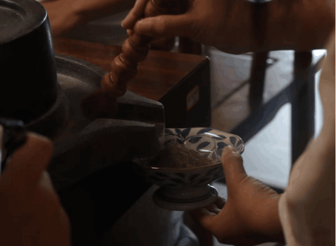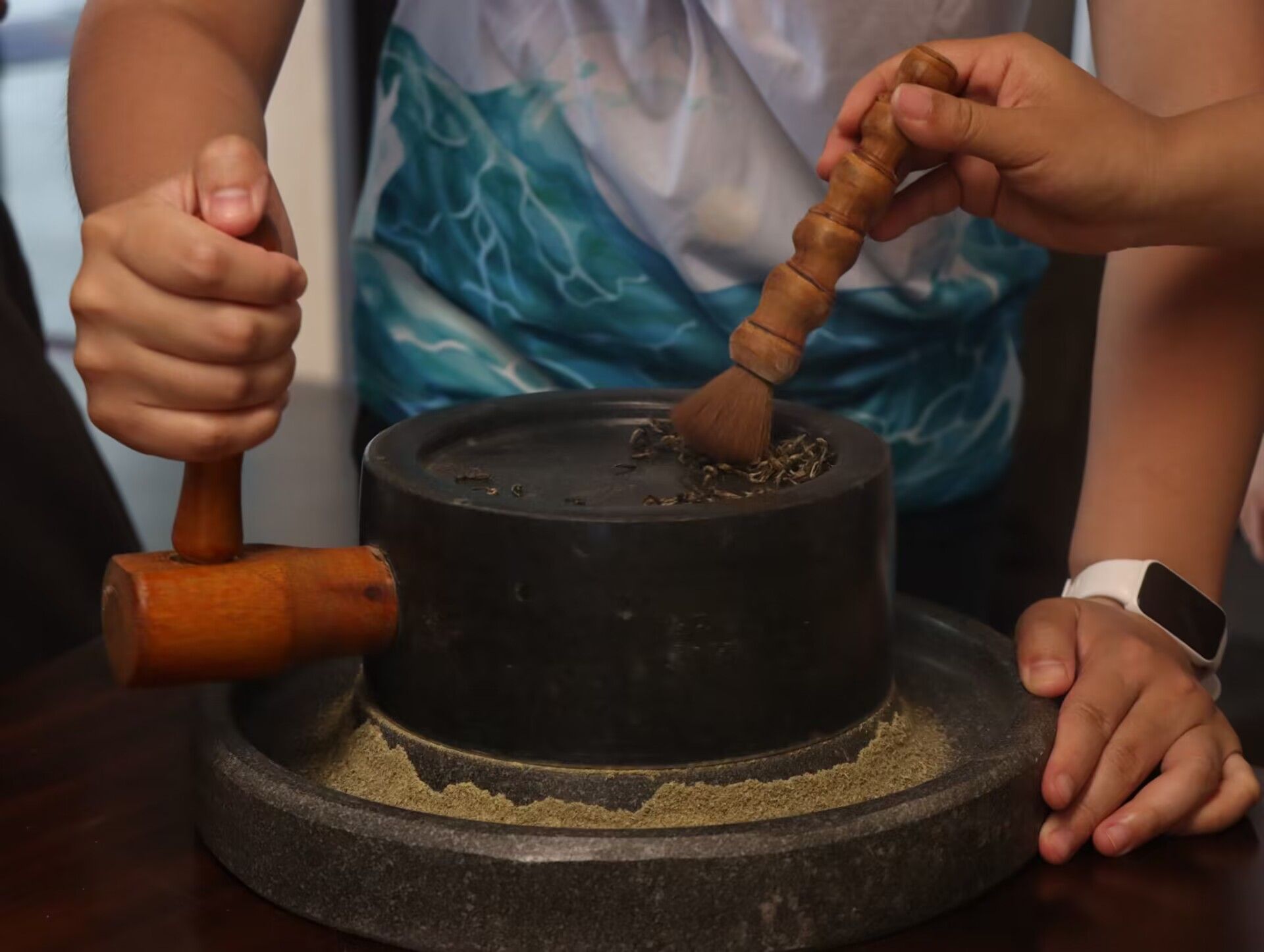 除此之外,我们还有幸体验了抹茶的制作过程:从采摘绿茶到搅碎、杀青、烘干、杀菌、研磨等多道工序,才能制出真正的抹茶。我们看着王宇老师小心翼翼地用石磨研磨,为了最大限度地保留抹茶的颜色和营养,耗时耗力,才深刻理解为什么市面上真正的抹茶价格如此昂贵。