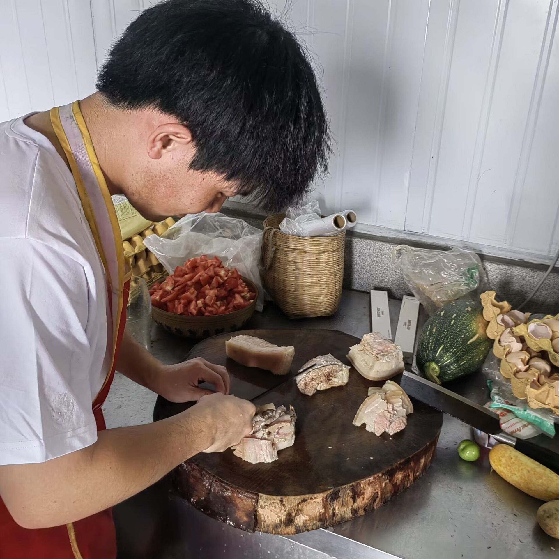 采茶是一件辛苦的细活,并非我们想象的那般诗意美好。在远离城市喧嚣的茶山里,茶农们起早贪黑,每天踩着朝露出发,伴着月光归来,一篓篓的鲜叶,是他们对辛苦最好的诠释。因此,为了更加深刻地体验到茶农们的生活,我们走出校园,来到茶园基地,洗手作羹汤,为团队成就一桌美味佳肴。同学们化身成为厨艺高手,铁锅在灶台上滋滋作响,炊烟推着菜香袅袅而起。各种菜肴香气四溢,其他等待已久的同学端着做好的菜来回穿梭。