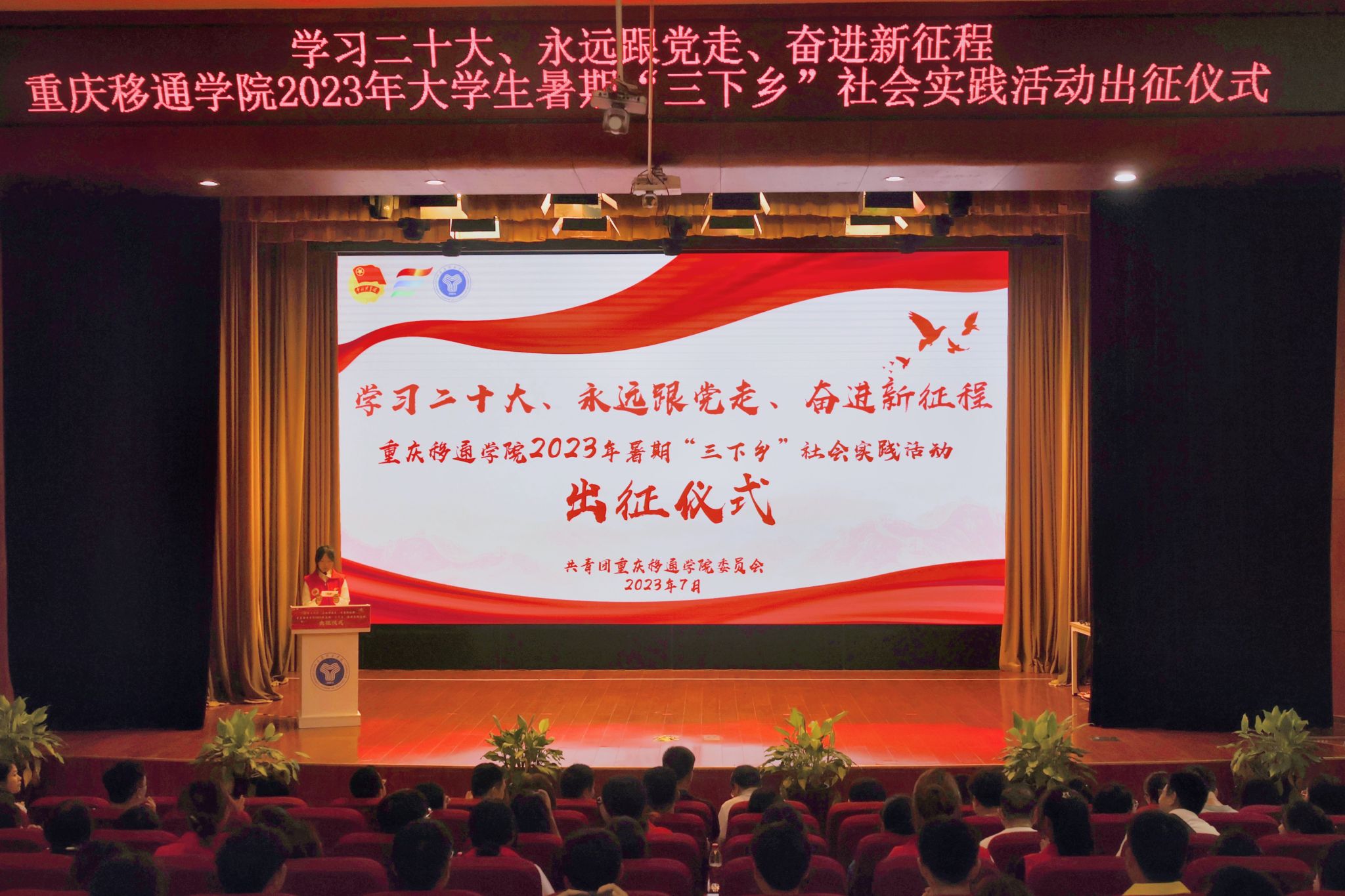 为深入学习贯彻习近平新时代中国特色社会主义思想,总书记关于“三农”工作的重要论述,全面贯彻落实党的二十大精神,引导广大青年在社会实践中“受教育、长才干、作贡献”,培养大学生的社会责任感,提高大学生的综合素质,塑造正确的认知,“立志做有理想、敢担当、能吃苦、肯奋斗的新时代好青年”。校团委于7月3日14:00在下里巴人剧场举行2023年暑期“三下乡”社会实践活动出征仪式。校党委组织宣传部部长苏述庚、学生处处长陈帅、校团委书记谢银平、书院部部长穆春江、竞技体育中心主任刘玉林、服务地负责人代表、各二级学院学工副院长、团总支书记及各“三下乡”实践团队师生代表400余人参加本次出征仪式。