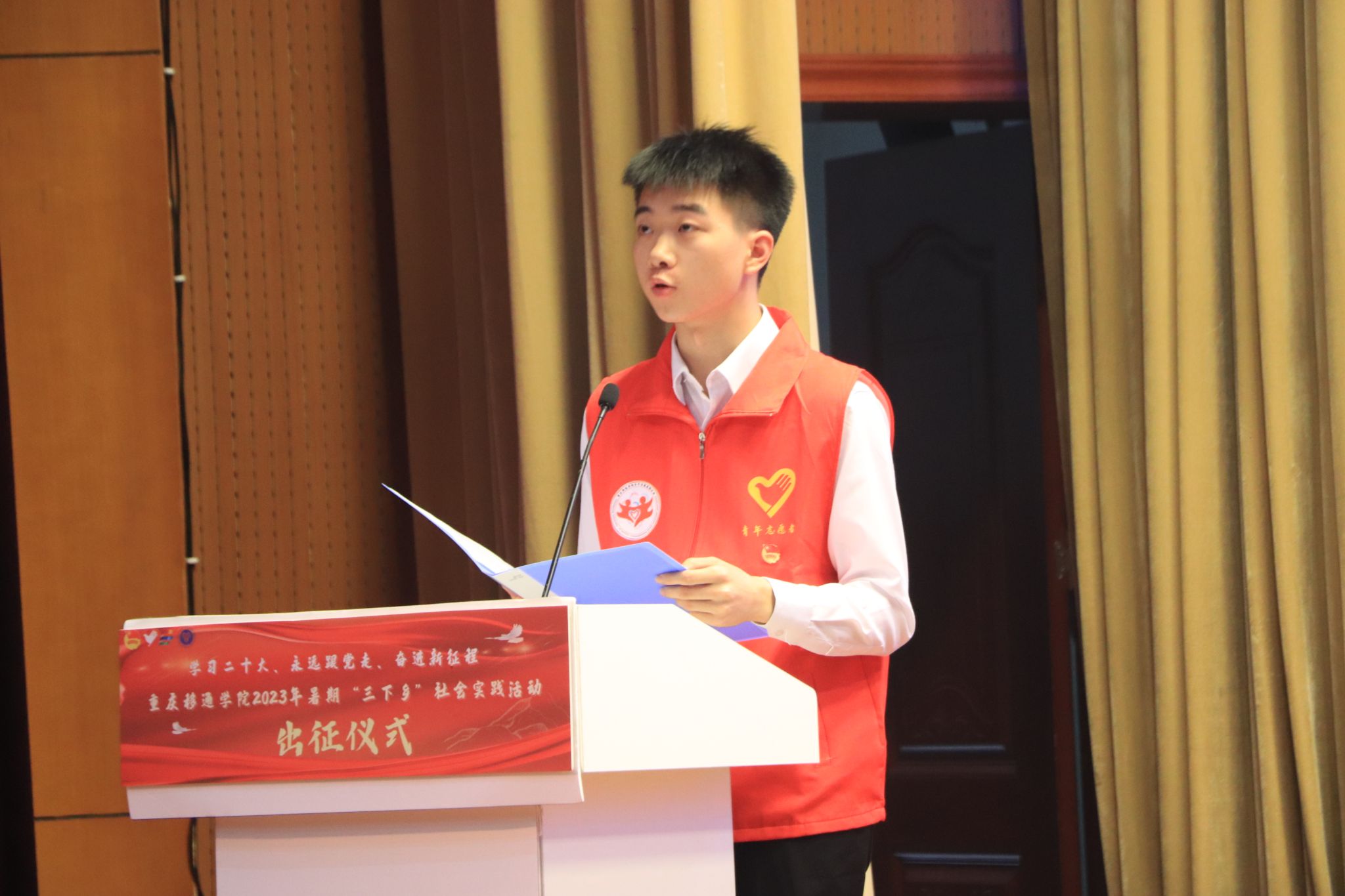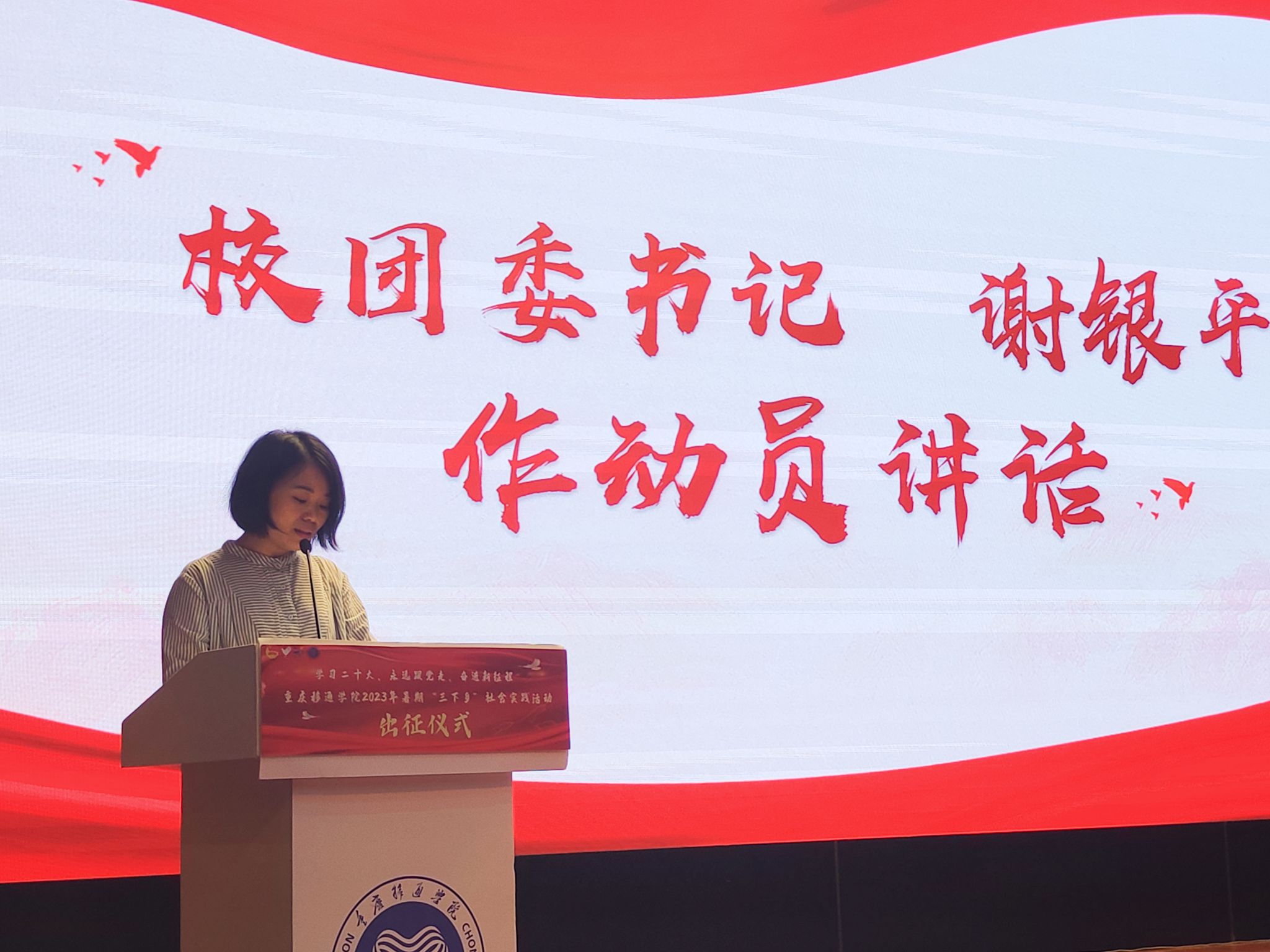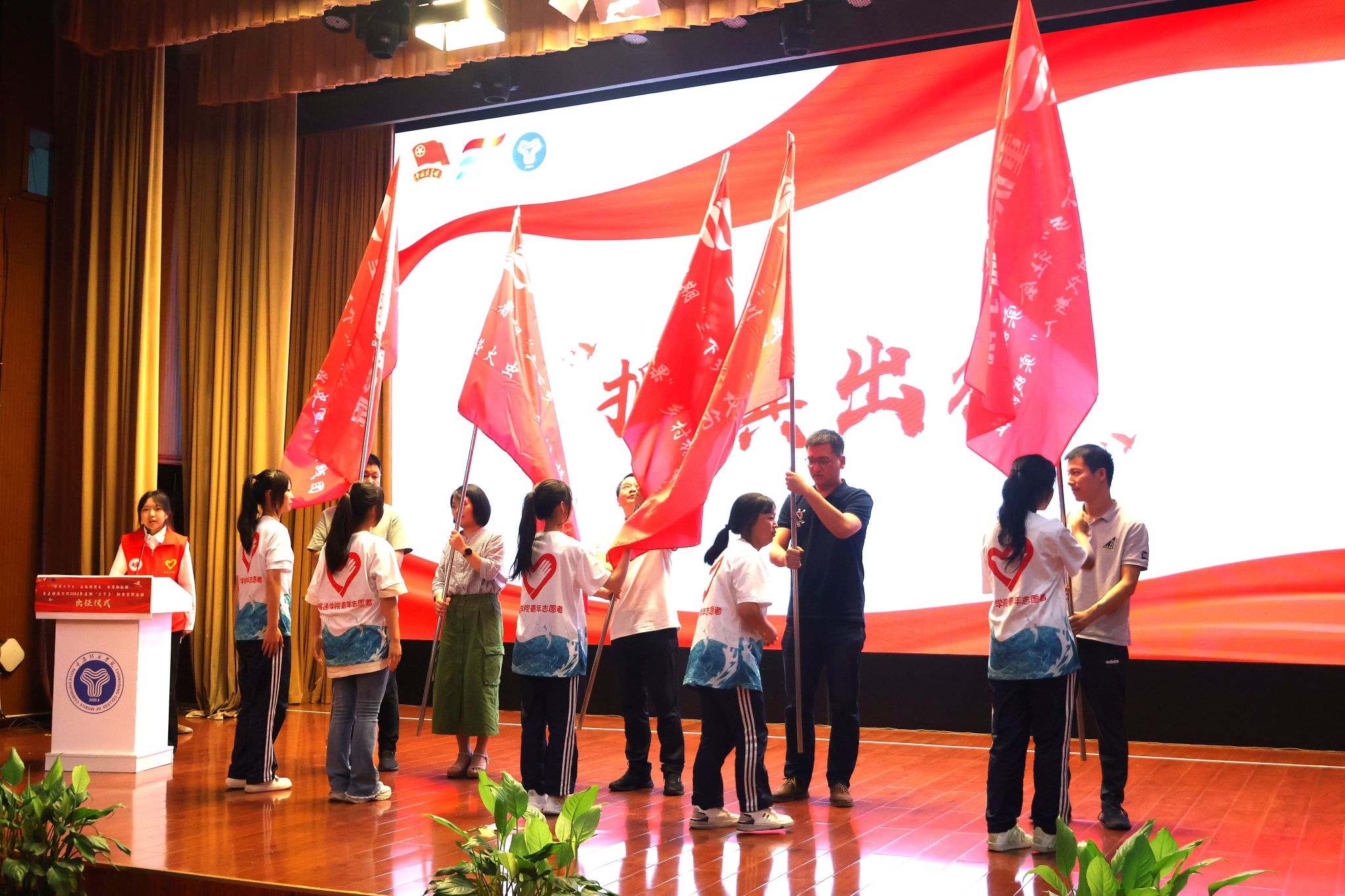 “我志愿加入重庆移通学院暑期“三下乡”社会实践活动,磨练意志、放飞理想、尽己所能、不计报酬、甘于奉献、服务大众,践行志愿精神,传播先进文化,自觉承担重任,深入基层一线,让青春在实现中华民族伟大复兴的中国梦中绽放异彩!”在志愿者谢星航的领誓下,现场所有青年志愿者志气高昂。宣誓完毕,志愿者代表庄严郑重地接过苏述庚、谢银平等6位老师手中的旗帜,成功地完成本次暑期“三下乡”活动的授旗仪式。13面旗帜高举在下里巴人剧院的舞台上,与旗帜一同飘扬的,是我校青年“坚定跟党走、建功新时代”的决心和力量