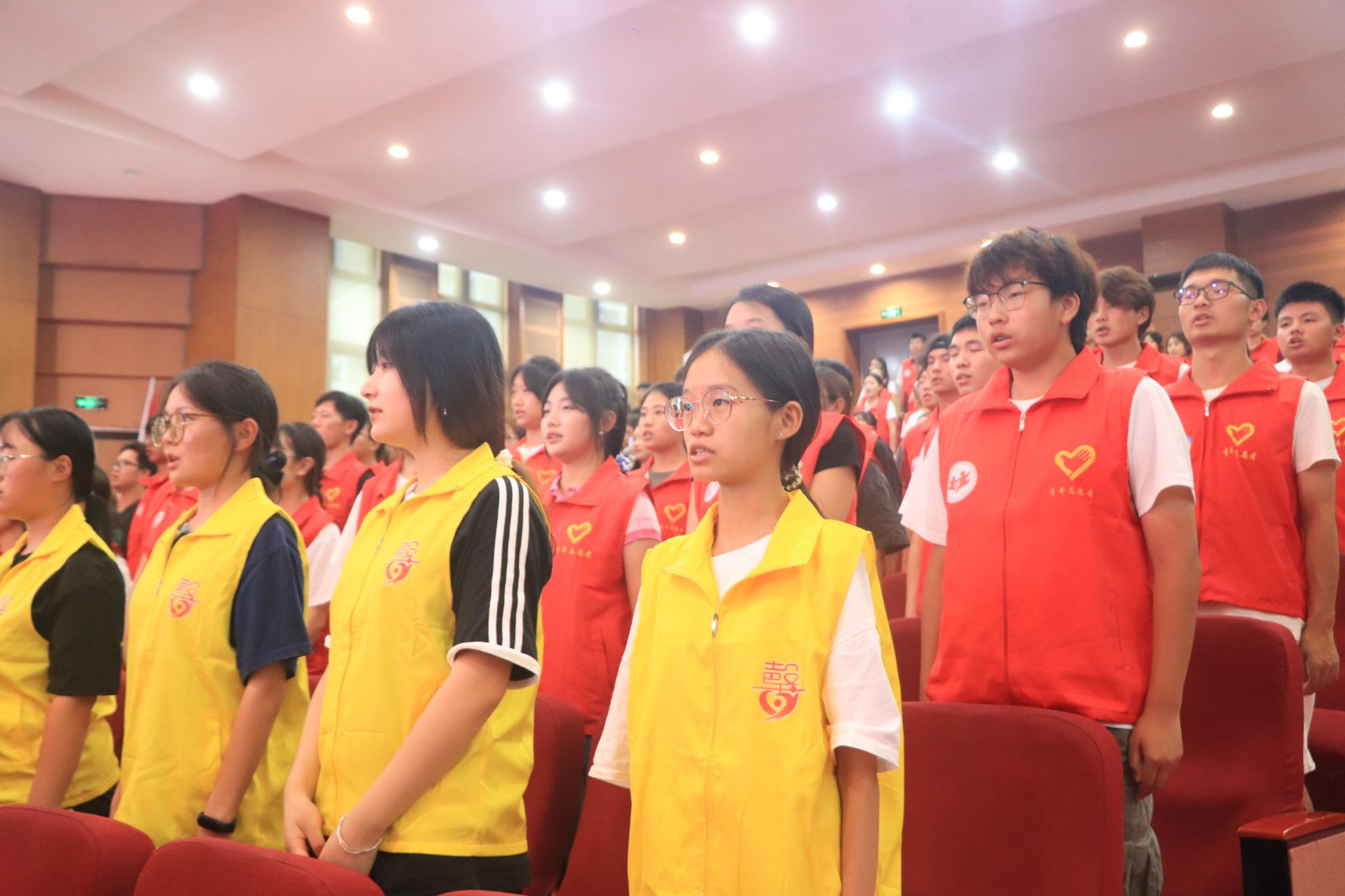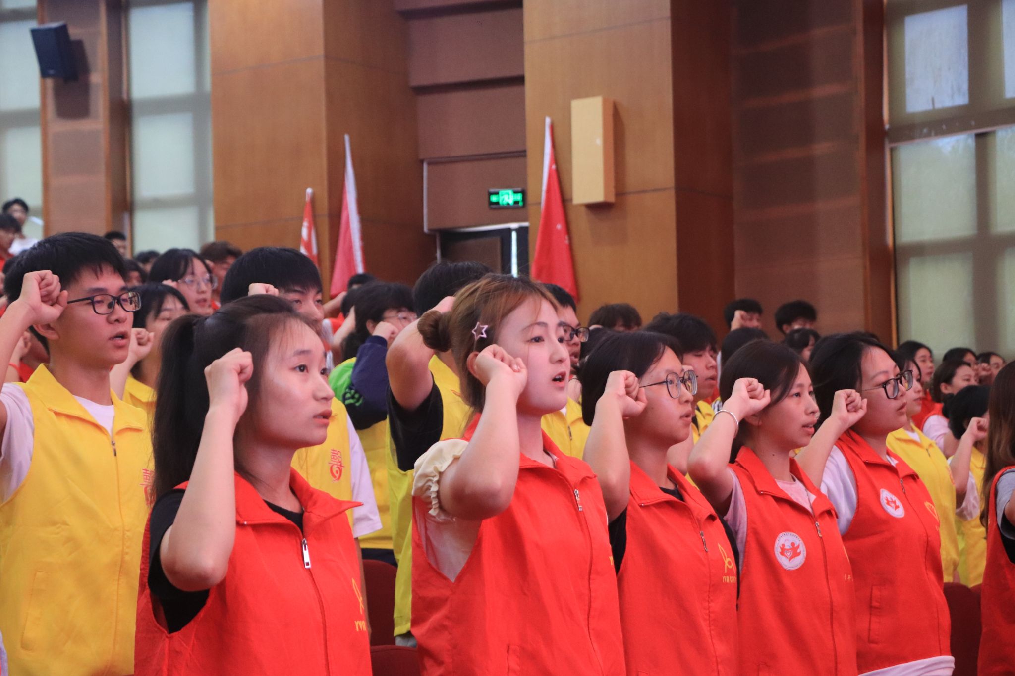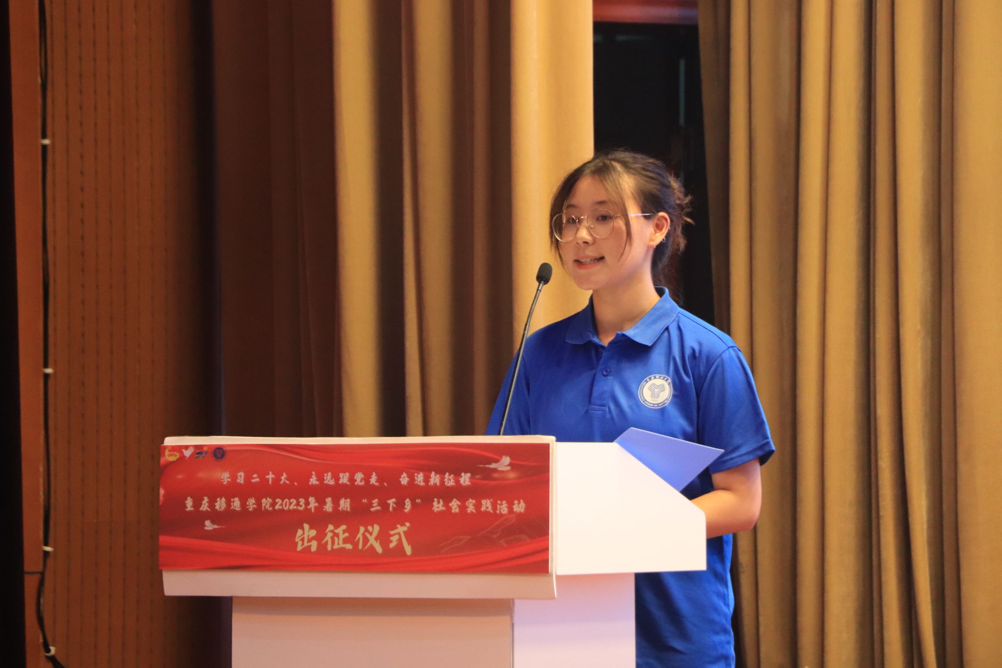 “我志愿加入重庆移通学院暑期“三下乡”社会实践活动,磨练意志、放飞理想、尽己所能、不计报酬、甘于奉献、服务大众,践行志愿精神,传播先进文化,自觉承担重任,深入基层一线,让青春在实现中华民族伟大复兴的中国梦中绽放异彩!”在志愿者谢星航的领誓下,现场所有青年志愿者志气高昂。宣誓完毕,志愿者代表庄严郑重地接过苏述庚、谢银平等6位老师手中的旗帜,成功地完成本次暑期“三下乡”活动的授旗仪式。13面旗帜高举在下里巴人剧院的舞台上,与旗帜一同飘扬的,是我校青年“坚定跟党走、建功新时代”的决心和力量