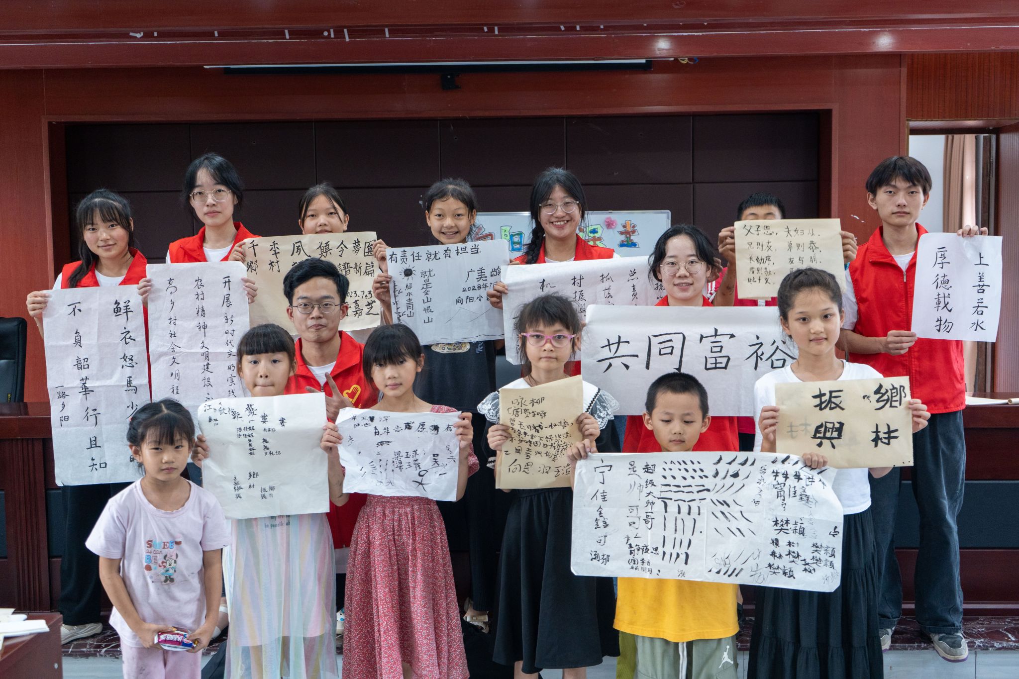 以笔绘出乡村振兴发展教育之路。“一路‘乡’阳”乡村振兴促进团携手鱼子村村委会,精心策划并开设毛笔书法课堂。旨在通过毛笔书法的教学,提升乡村青少年的艺术修养和创造力。为孩子们深入浅出地讲解毛笔书法的起源、历史背景以及传统技巧,让孩子们对毛笔书法的艺术内涵和文化价值有更深刻的认识,树立起孩子们对中华优秀传统文化的认同感和自豪感,争做中华优秀传统文化的传承者、践行者、弘扬者。