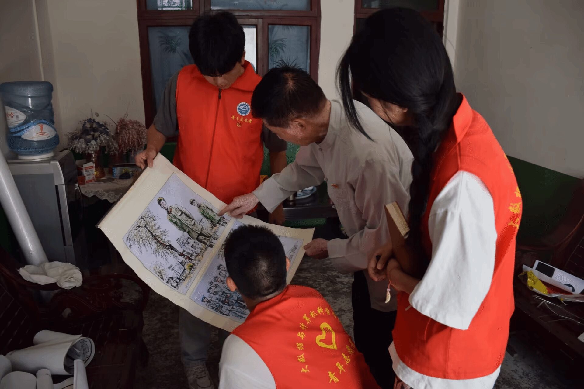 志愿团特围绕“学习红军艰苦精神”为主题展开了学习编织草鞋和访谈红色人物的活动。志愿者们来到老爷爷家里,学着老爷爷的样子编制草鞋,一开始志愿者们不是很熟悉,也很拘谨,但在老爷爷的鼓励下很快上手,编织出一双草鞋。本次红军草鞋制作的初体验,让志愿者们感悟革命实不易。志愿者们来到老党员陈光和同志家里,陈光和是一名拥有三十年多年党龄且目前从事于羊角村红色文化传播的讲解员。当志愿者进入他家中时,发现其家周围的墙壁上贴满了关于祖国的画报,包括中国地图、重庆綦江安稳镇地图、毛主席的画报等,桌子上放着关于教育的书籍。他心中一直装着“红军长征精神”,支撑着他走出大山又回到大山当起老师,给孩子们插上理想的翅膀,帮助他们飞出大山。