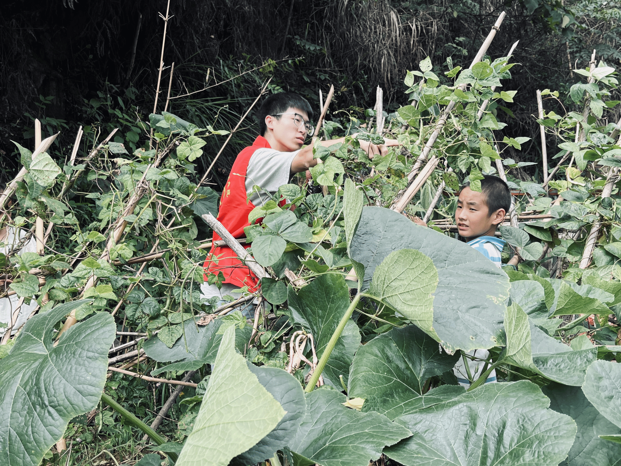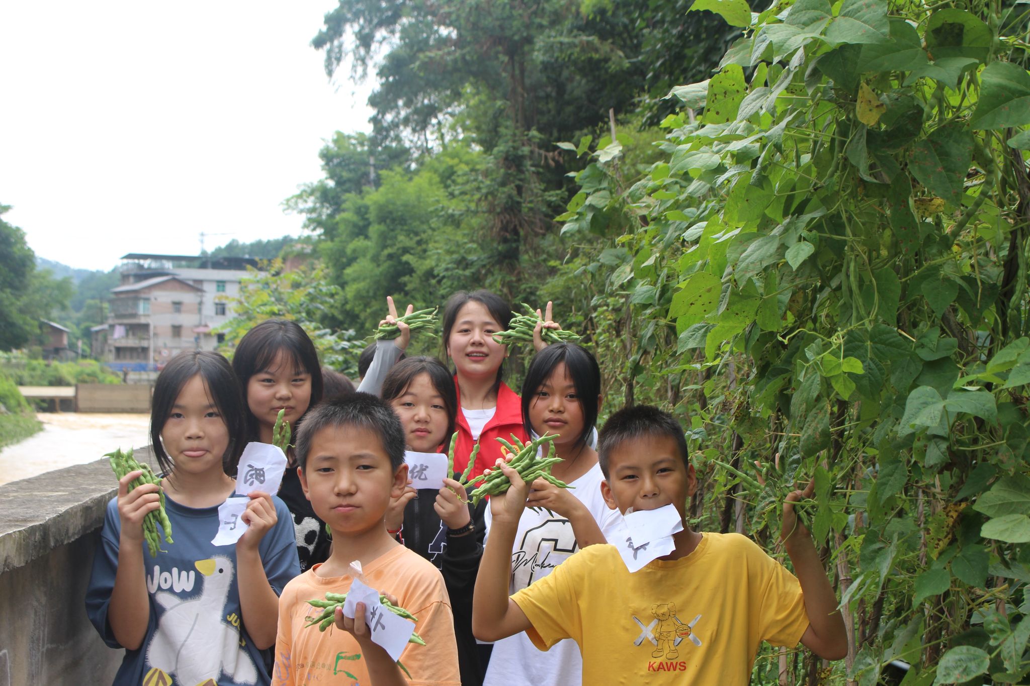 劳动教育欢乐多,实践理论相结合。“益守汉字”队旗随风飘扬,志愿者们带领小朋友们一一前往目的地。在劳动中,小朋友们在玉米地、李子地、豆角地里进行劳动实践教育小游戏。采摘豆角、李子,剥玉米,在其中发现汉字纸条、诗句碎片。与志愿者哥哥姐姐们,一起收获快乐与劳动成果。