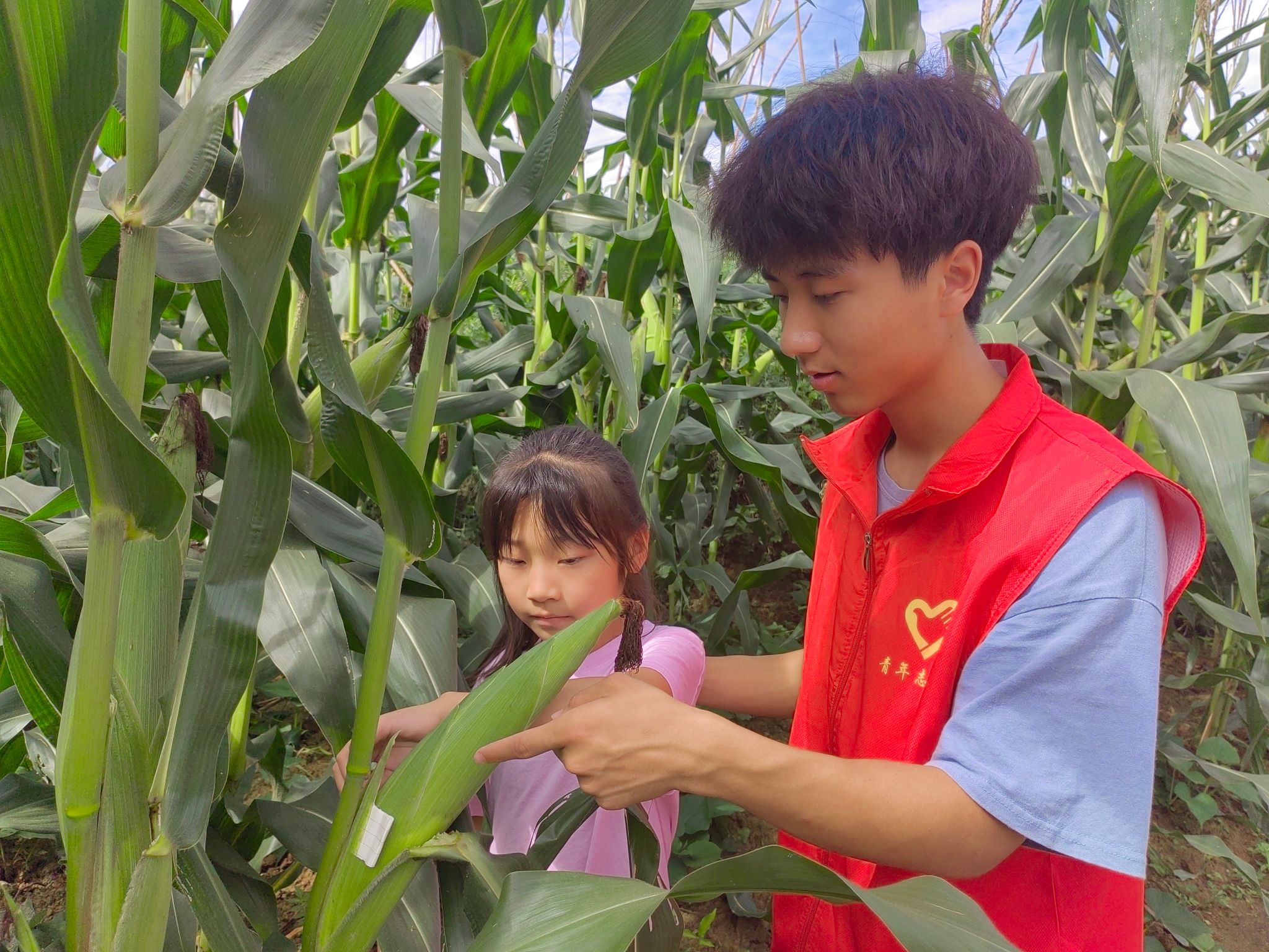 四个服务点的志愿者们采用将汉字传统文化与劳动教育相结合的形式,开展了“字丛‘玉’见你”——“寻字觅诗”户外劳动实践活动。志愿者们首先为小朋友们讲解“耕”的象形字的结构和演变,然后通过在玉米地里面掰玉米寻找文字碎片,联想诗词,拼成诗句,最后评出小组名次。