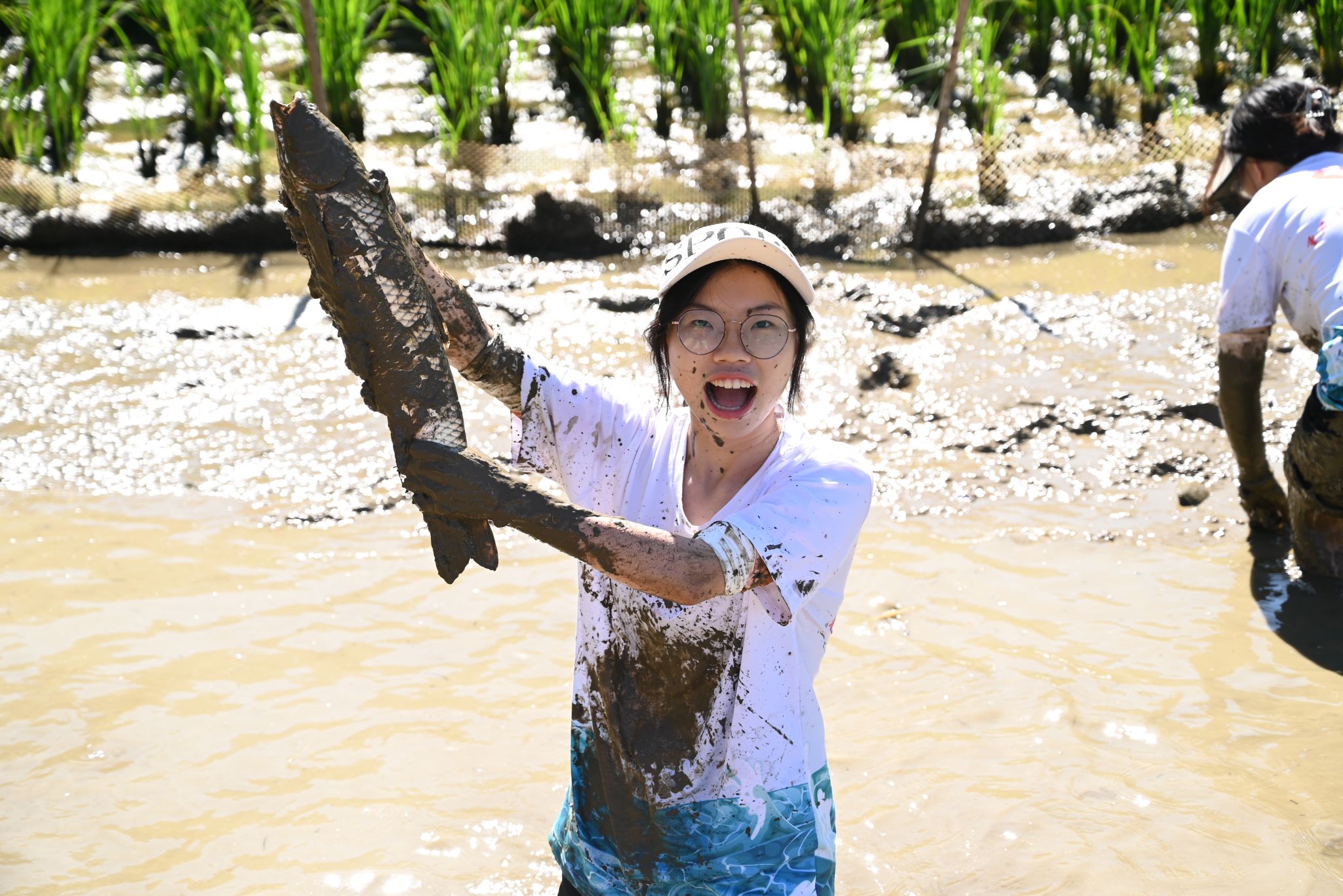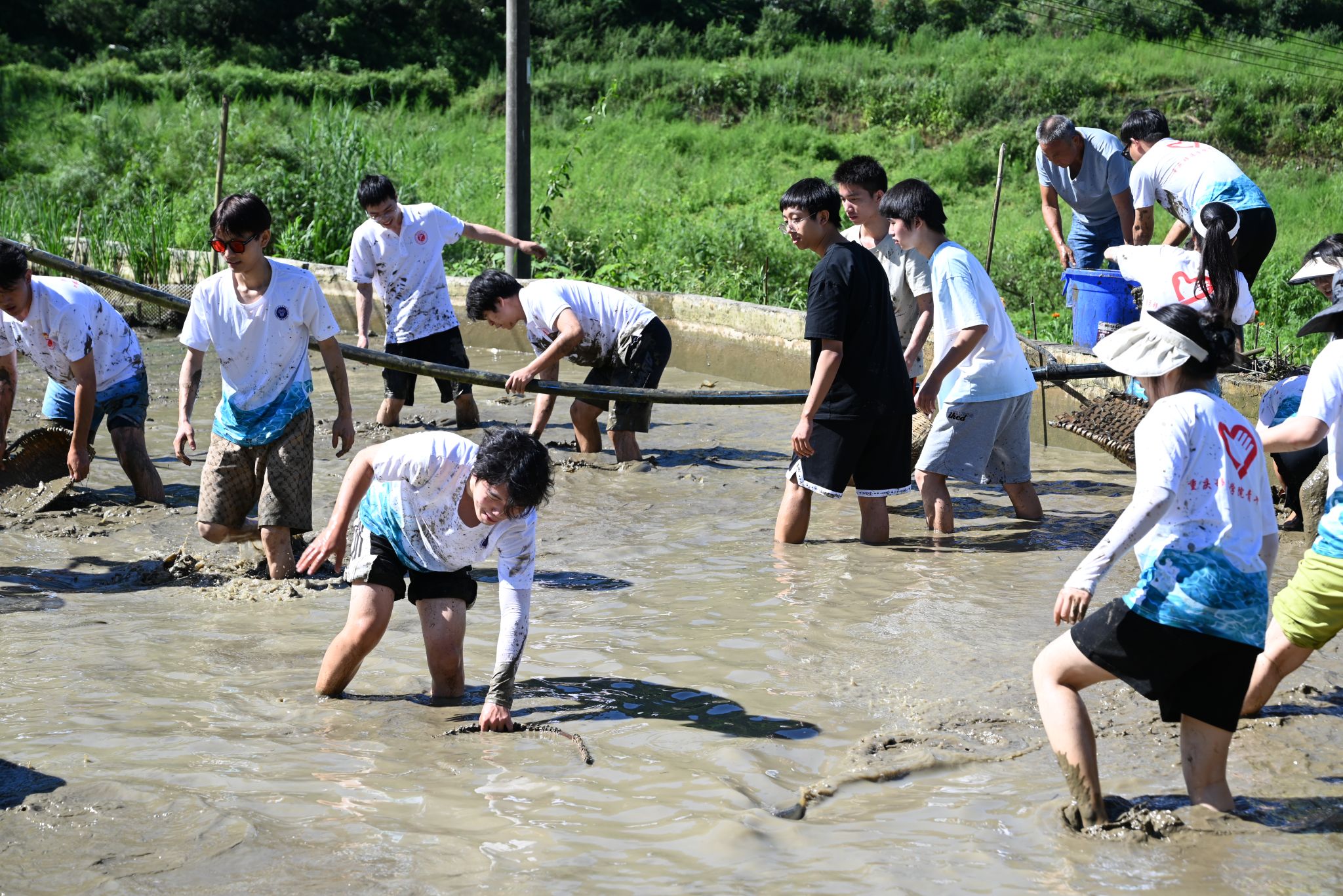 7月5日上午,重庆移通学院、西南大学、重庆理工大学,三校联动,队员们迎着骄阳徒步40分钟抵达稻鱼共养养殖地,炽热的阳光没能使队员们对捕鱼的热情褪去半分。大家一齐站在稻田旁,感受着独特的田间气息,挽起裤脚,深入泥田。鱼儿在水中游弋穿梭,队员们在泥田里双手并用,一心只想捉到更多的鱼,即使浑身沾满泥泞依旧毫不在意。经过“捕鱼人”的不懈努力,鱼儿不断“落网”。在捕鱼过程中,稻田废弃物和鱼粪等有机肥料得到有效利用,实现了农田和水域的有机循环。