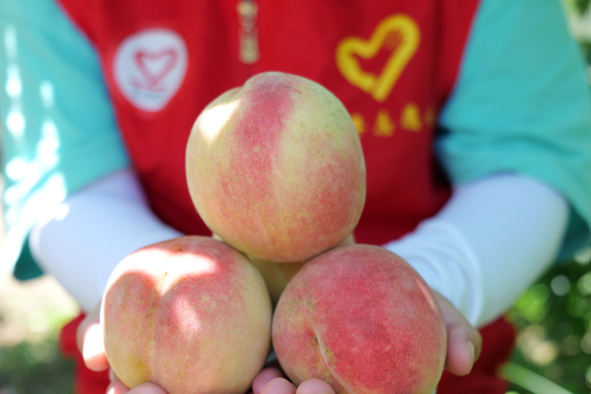 “摘桃子先看蒂,用刀割更方便。”毛园长为幸福儿们耐心讲解桃树的生长过程和桃子的采摘技巧。随后毛园长带领幸福儿们进入桃林,让幸福儿在桃树下进行实地操作。第一次进入桃林亲手采摘桃子,幸福儿们怀着激动的心情在烈日之下跟随毛园长进行采摘作业。弯腰低头、摘掉套袋、一手捏树枝、一手割桃蒂,毛园长轻车熟路地为幸福儿们演示。幸福儿们穿梭在低矮的桃树之间,汗流浃背,圆润而饱满的桃子一个接一个被采摘下来,桃林里面充满幸福儿劳作的身影。