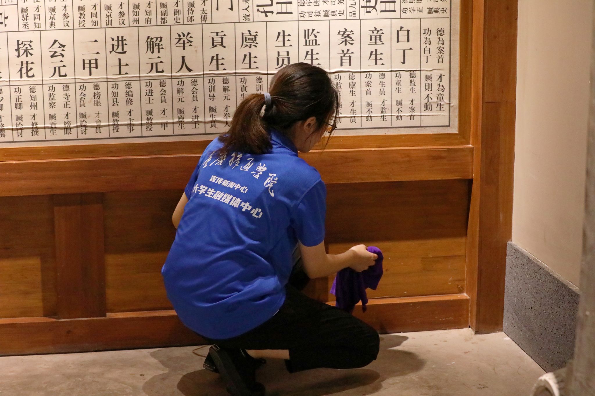 调研期间,团队成员抓住传统文化传承、便民公园建设与旅游观光景区宣传协调发展之间的要点,走访孔子文庙纪念品商店、采访景区工作人员,现场体验旅游景区的经营与维护;主动帮助环卫工作人员扫除园区落叶;参与考院展览馆日常维护;志愿为游客讲解举子乡历史文化等。