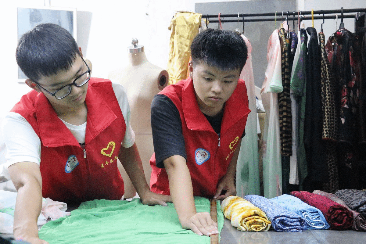 旗袍制作过程中,蒋老师鼓励、指导实践团成员在制作台上尝试进行各项工序,包括布料检查、划线定位、裁剪等。