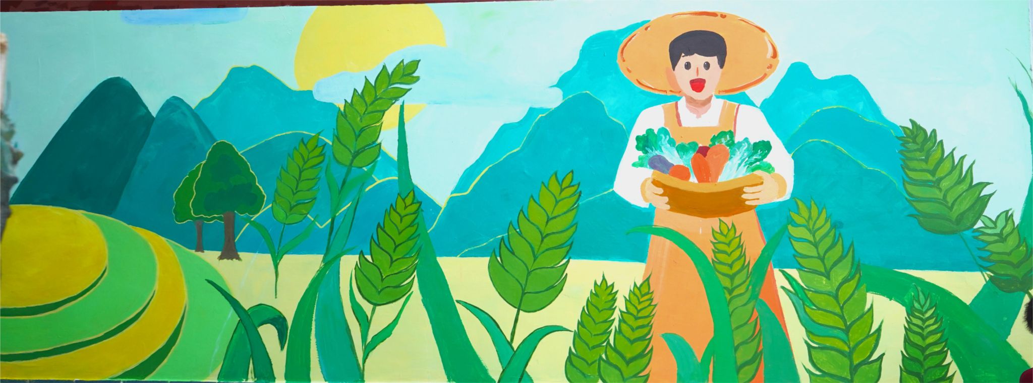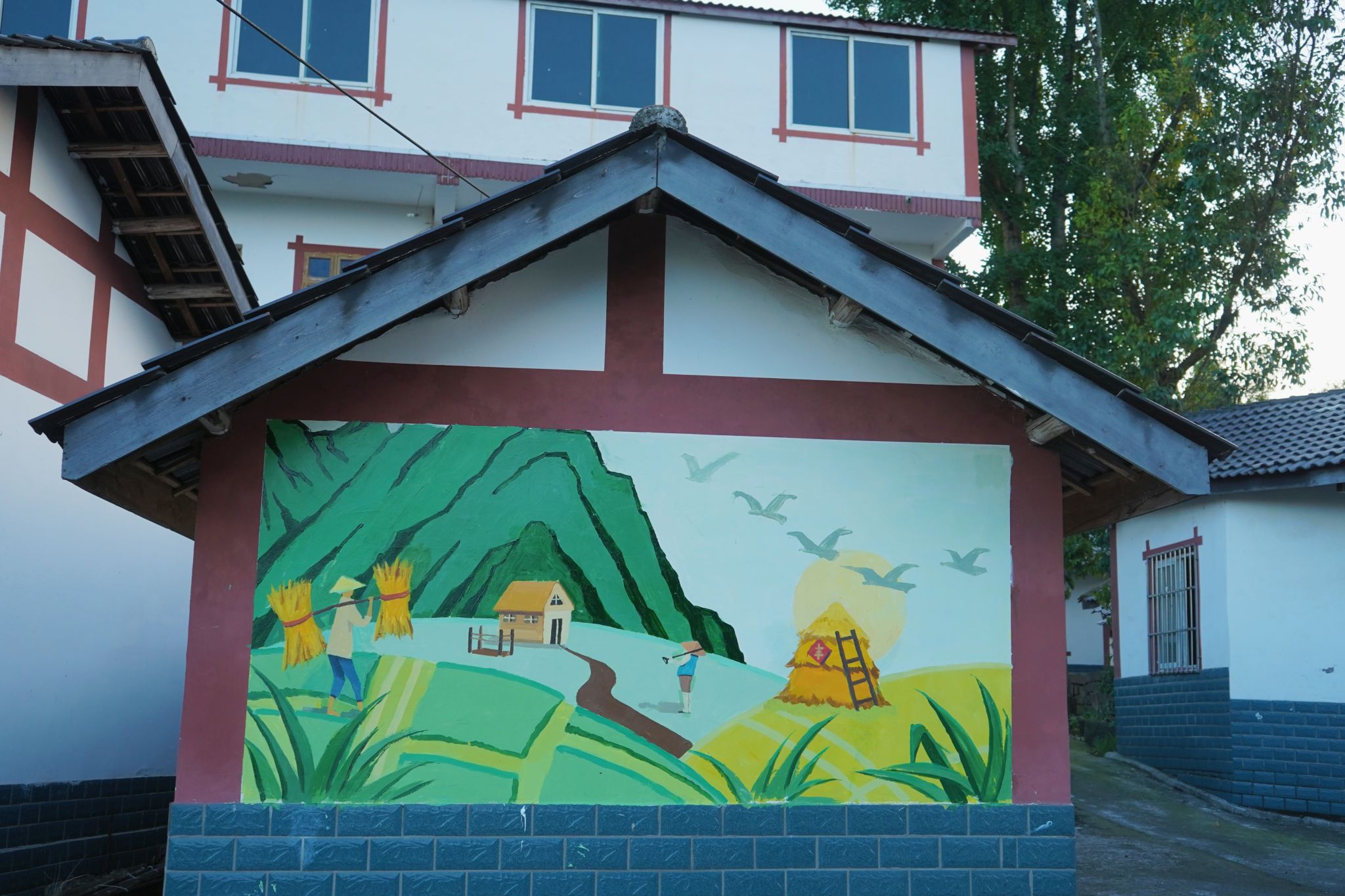 五彩斑斓的墙绘中,农民们日出而作,日落而息,绵延绿色的大山、曲折蜿蜒的小路、青葱翠绿的田野、外出农作的农民、金黄丰满的稻穗等构成了一幅充满农村生活气息的宣传多彩墙绘。