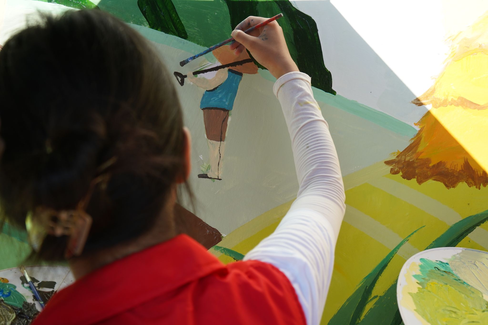 “美益乡村”文化艺术服务团的志愿者们不畏烈日,身穿红马甲,心中有力量。成员们分为三组,由小组长带领,进行第一组以七星村特色风光为主题的墙绘创作,开启美化乡村环境的进程,让广大村民欣赏彩绘,激发建设美丽乡村的热情。