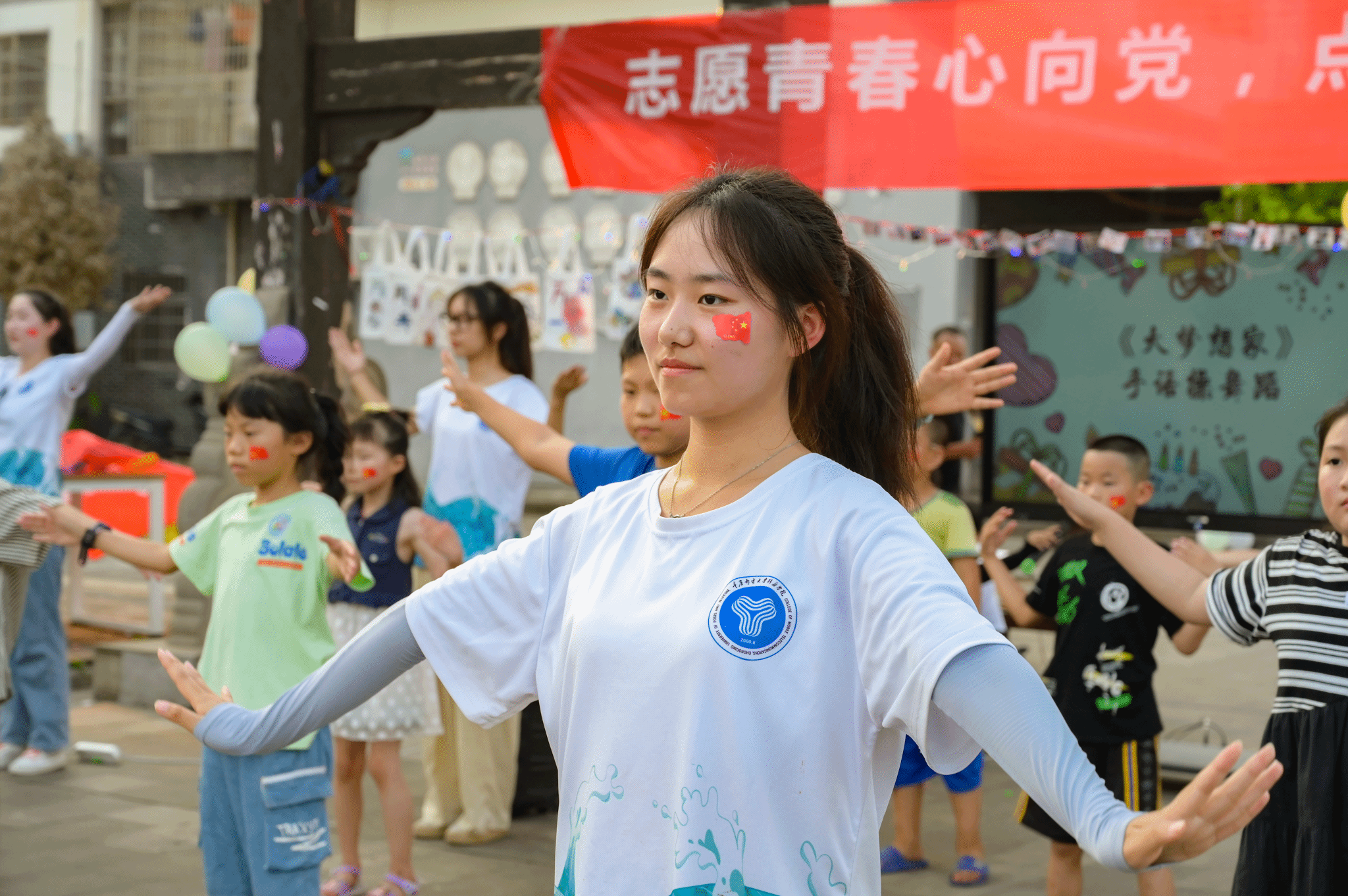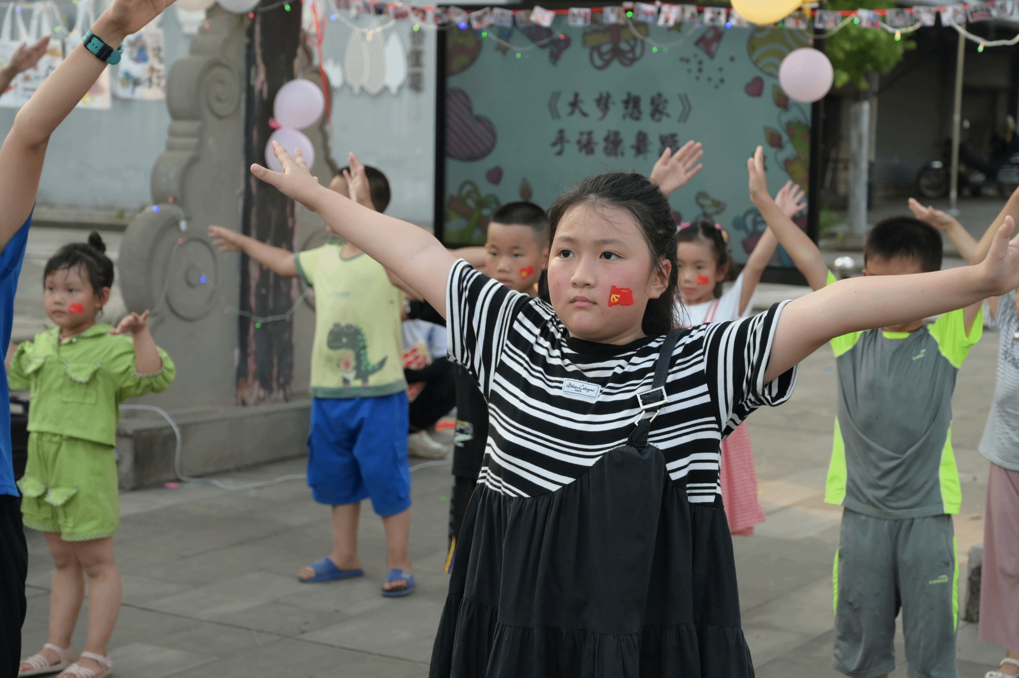手语操、现场演讲、T台走秀、感动大合唱......夕阳余晖,筑梦服务队把沉浸式舞台表演搬到大柱村中,随着缤纷的彩灯亮起,“柱”梦集体生日会暨结业仪式正式开始,手语舞动,身姿优美,《大梦想家》展示了小朋友们一个个舞步沿着梦想的轨迹飞翔,展示出无限的创造力和表达力。
