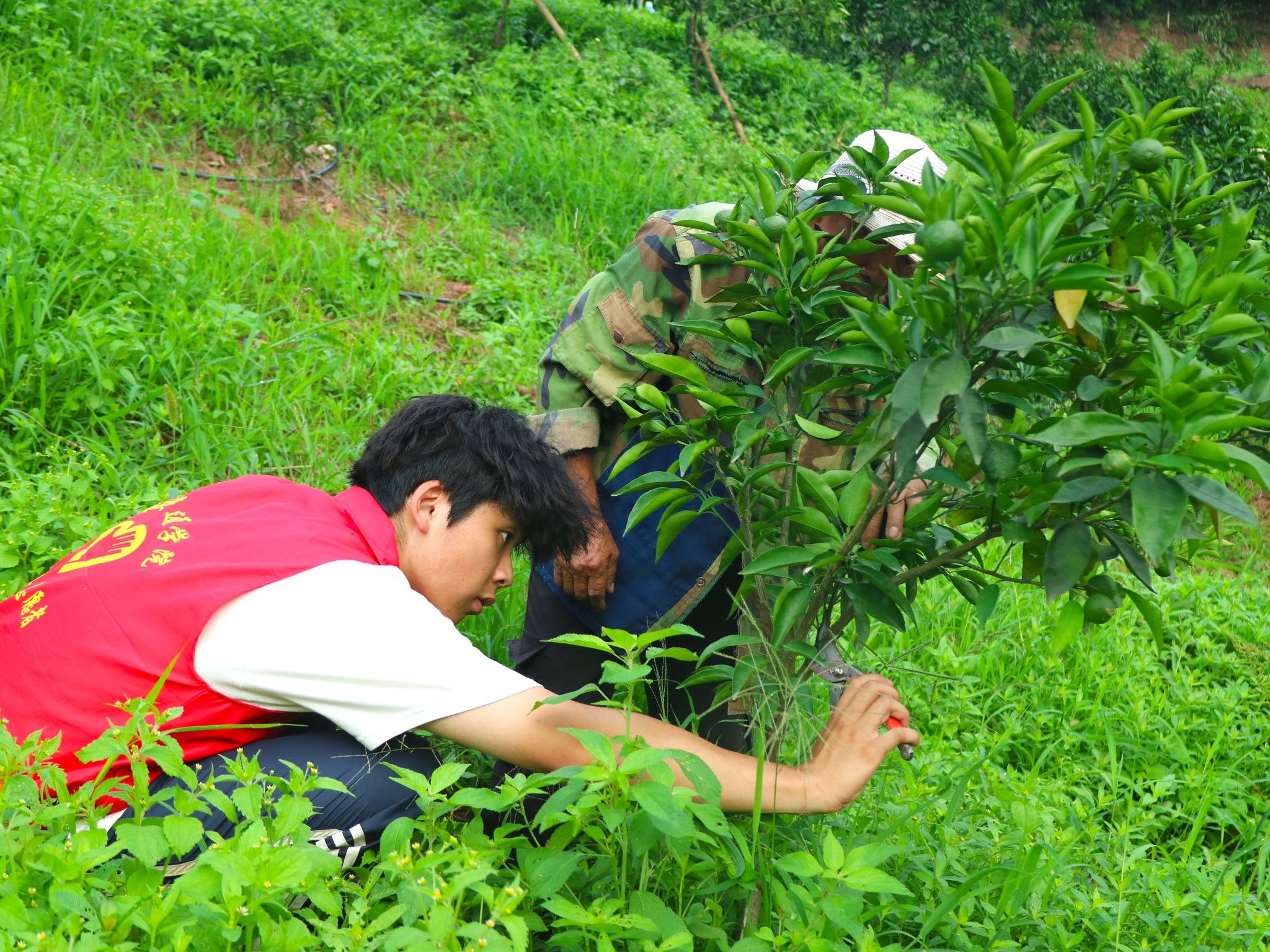 管理员秦东升带领实践团体验果园工作,果农们正忙于帮果树修剪枝丫,实践团上前询问果农修剪枝丫的细节之处,果农们给实践队员做示范,并告诉队员主要修剪的是果树上垂吊的枝条和零散的叶片。帮助减少果树能量的分配,促进果实的成长,同时也保持果树的美感。果农将剪刀给实践队员实践,裁剪时重点提醒队员们要注意树上的刺头,并十分热情的分批次教学指导志愿者对果树的裁剪。果园里的工作不只是对果树的修剪,也有对杂草的清除,除草用到的是除草机,便于米坊村老年村民操作,有利于改善米坊村村民生活水平收入,促进米坊村经济发展。