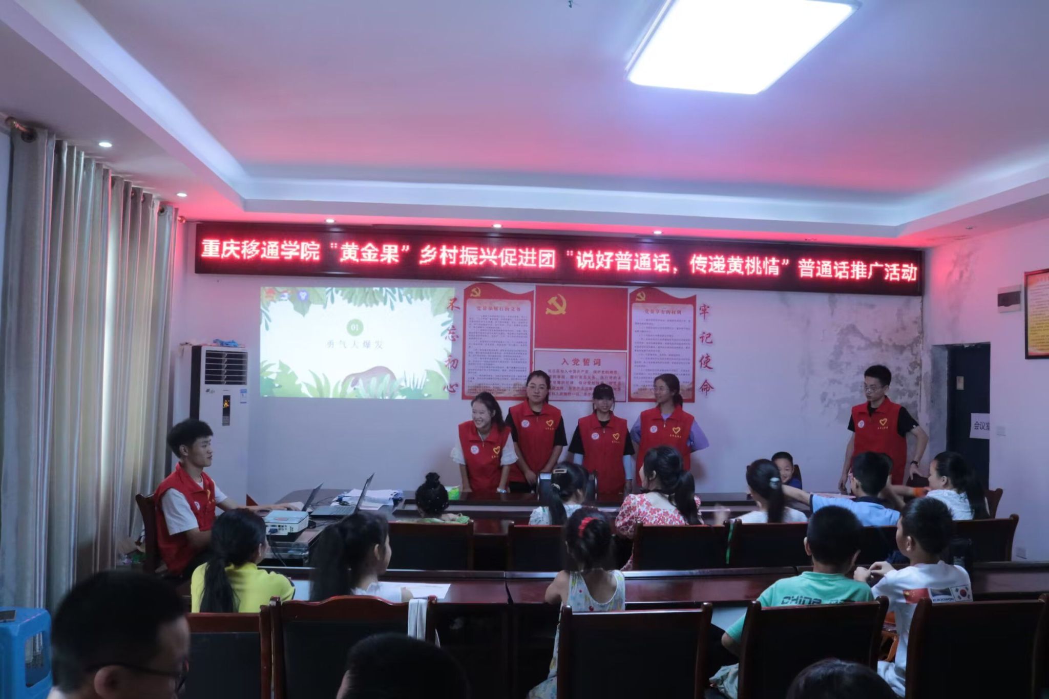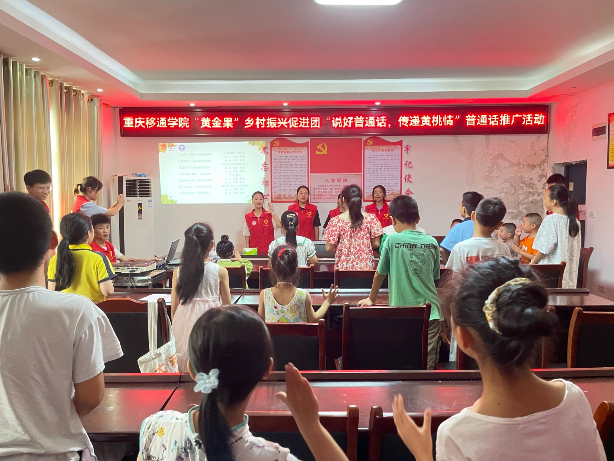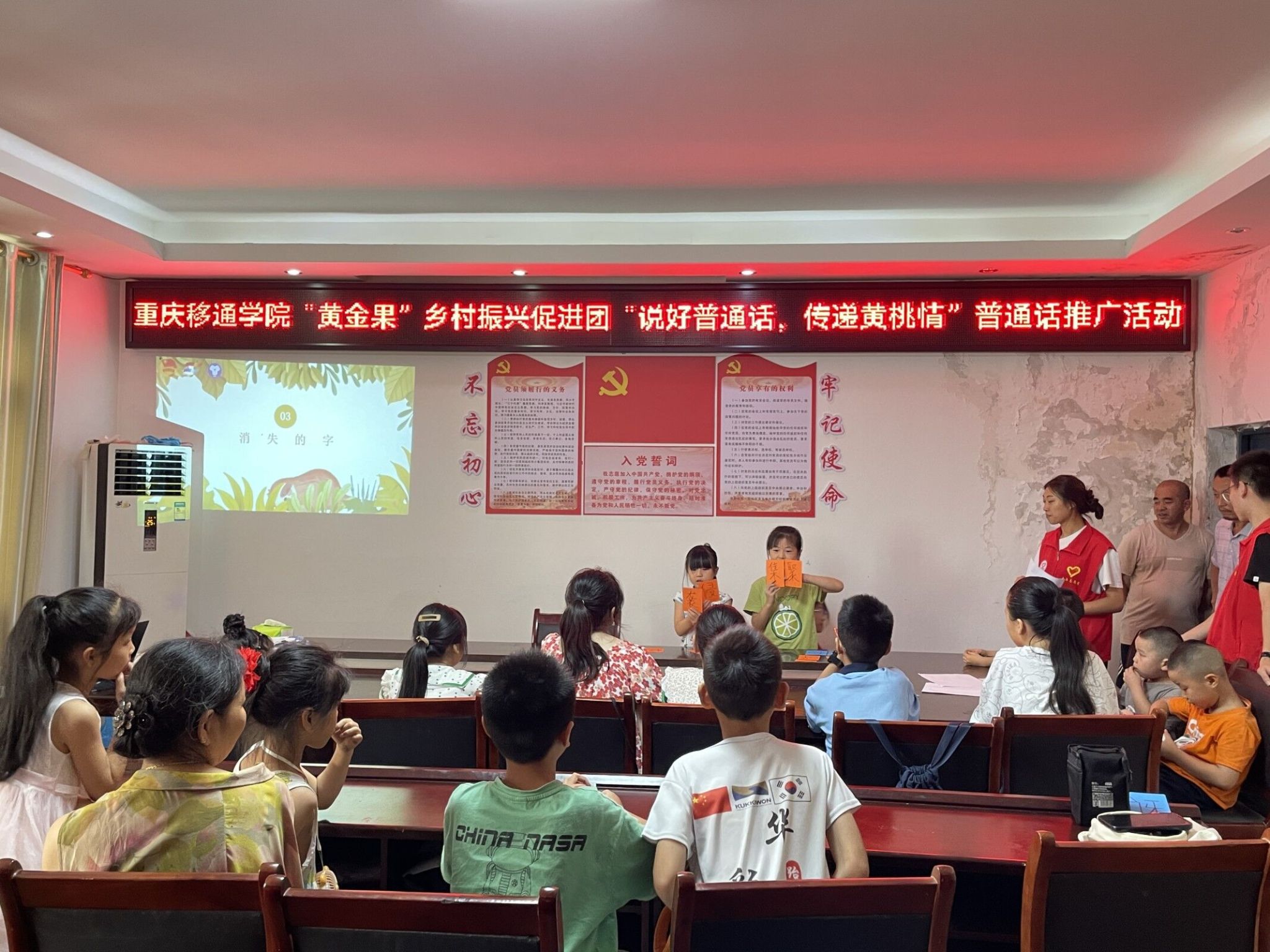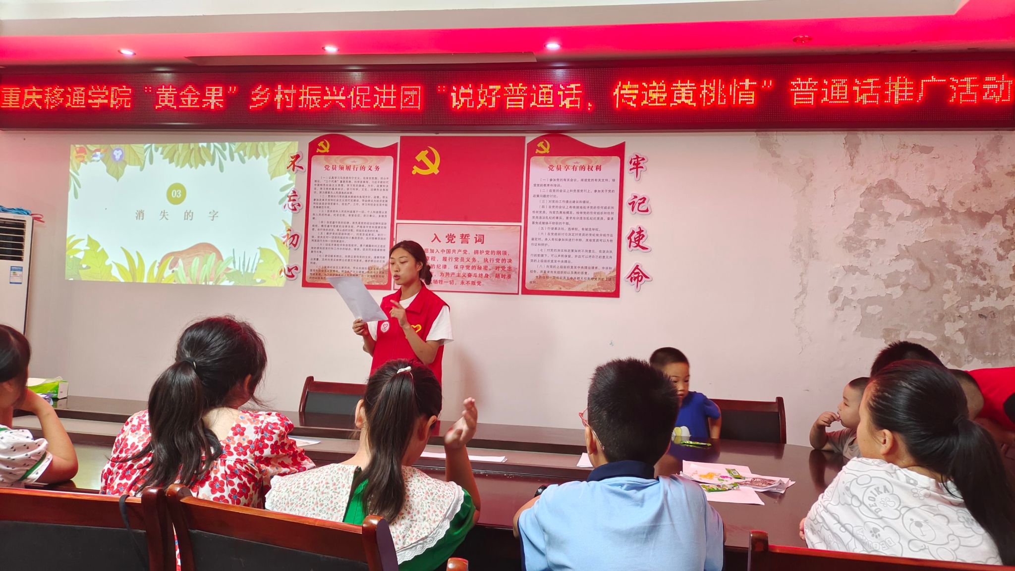“普华夏语言,通九州文化,话中华盛世”。我国是多民族,多语言,多方言的人口大国,方言种类繁多、体系冗杂,不同地区人民交往的最大阻碍往往就是方言的不通。作为建设社会主义现代化强国的一项基础性工程,全国通用普通话的推广以及普及是关键要点。“黄金果”乡村振兴促进团为了深入宣传国家语言文字、促进普通话推广、文字规范教育以及扎实孩童说普通话的标准度,融入太和本地文化元素以黄桃元素为媒介于2023年7月12日驱车前往马门溪社区开展普通话推广活动。