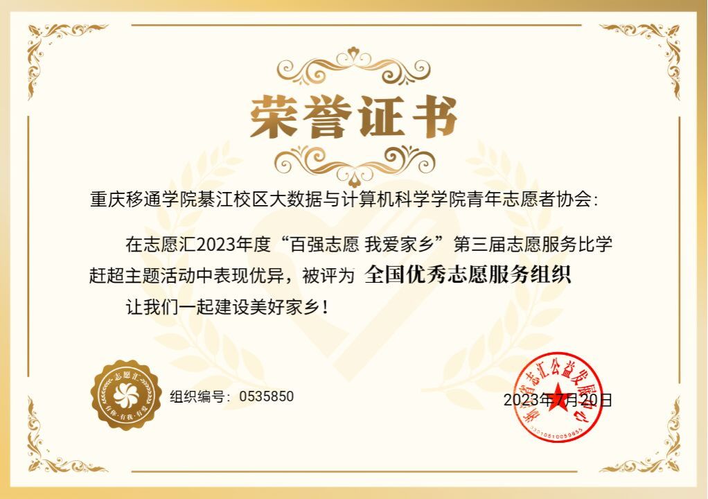 百强志愿,我爱家乡。在2023年7月20日,大数据与计算机科学学院青年志愿者协会获得了志愿汇2023年度“百强志愿 我爱家乡”第三届志愿服务比学赶超主题活动全国优秀志愿服务组织称号,激励学院青协在服务家乡、乡村振兴的志愿实践中不断前行。