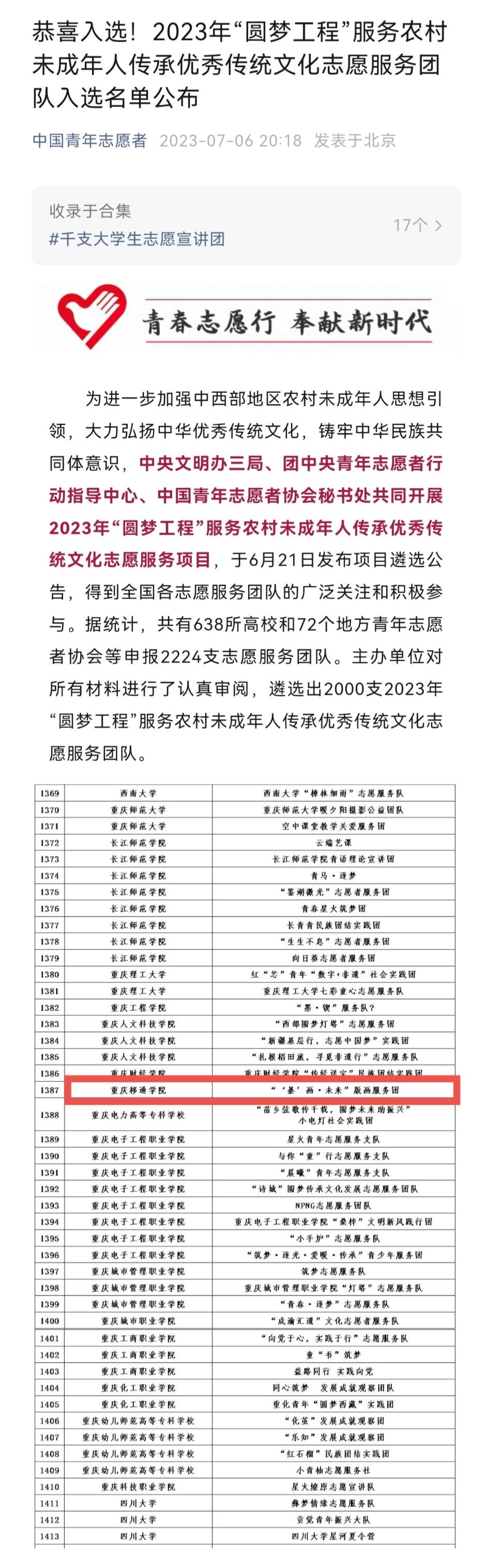 据了解,在2023年暑期“三下乡”社会实践活动中,大数据青协组建了两支队伍,共40余人前往綦江区安稳镇、万盛经开区黑山镇开展乡村振兴实践,还入选了2023年“圆梦工程”服务农村未成年人传承优秀传统文化志愿服务团队,即将开展綦江版画文化传承志愿服务相关工作,用更多行动去广泛引导大学生在当地或家乡的社会实践活动中受教育、长才干、作贡献,为立足本地,服务本地的愿景注入移通青年学子的志愿力量。