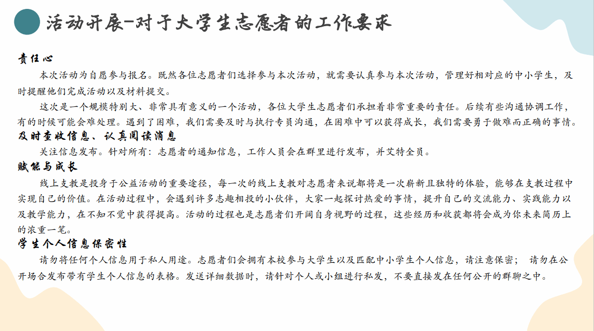云端支教,步履不停。为全面保障“一起云支教”专项活动正常有序开展,引导我院学生积极参与暑假“返家乡”社会实践活动,我院开展了青年志愿者的招募,招募青年志愿者人数为104人,并设立了活动执行专员与宣传专员。之后并进行了一系列活动的准备工作,对本学院的所有青年志愿者及执行宣传专员开展线上培训等。