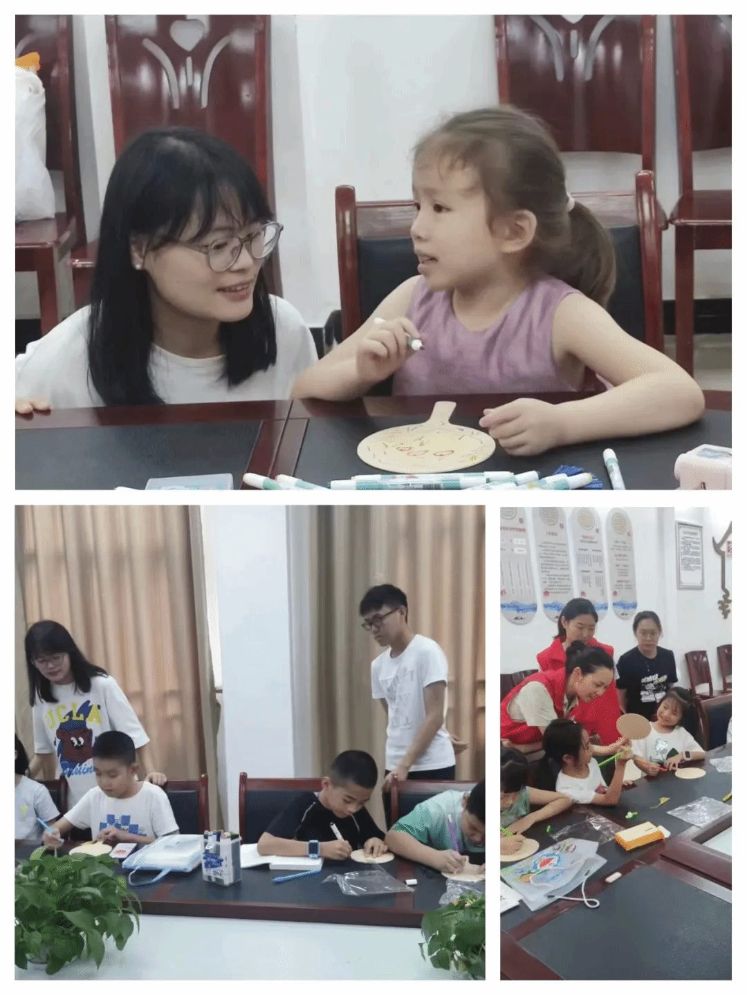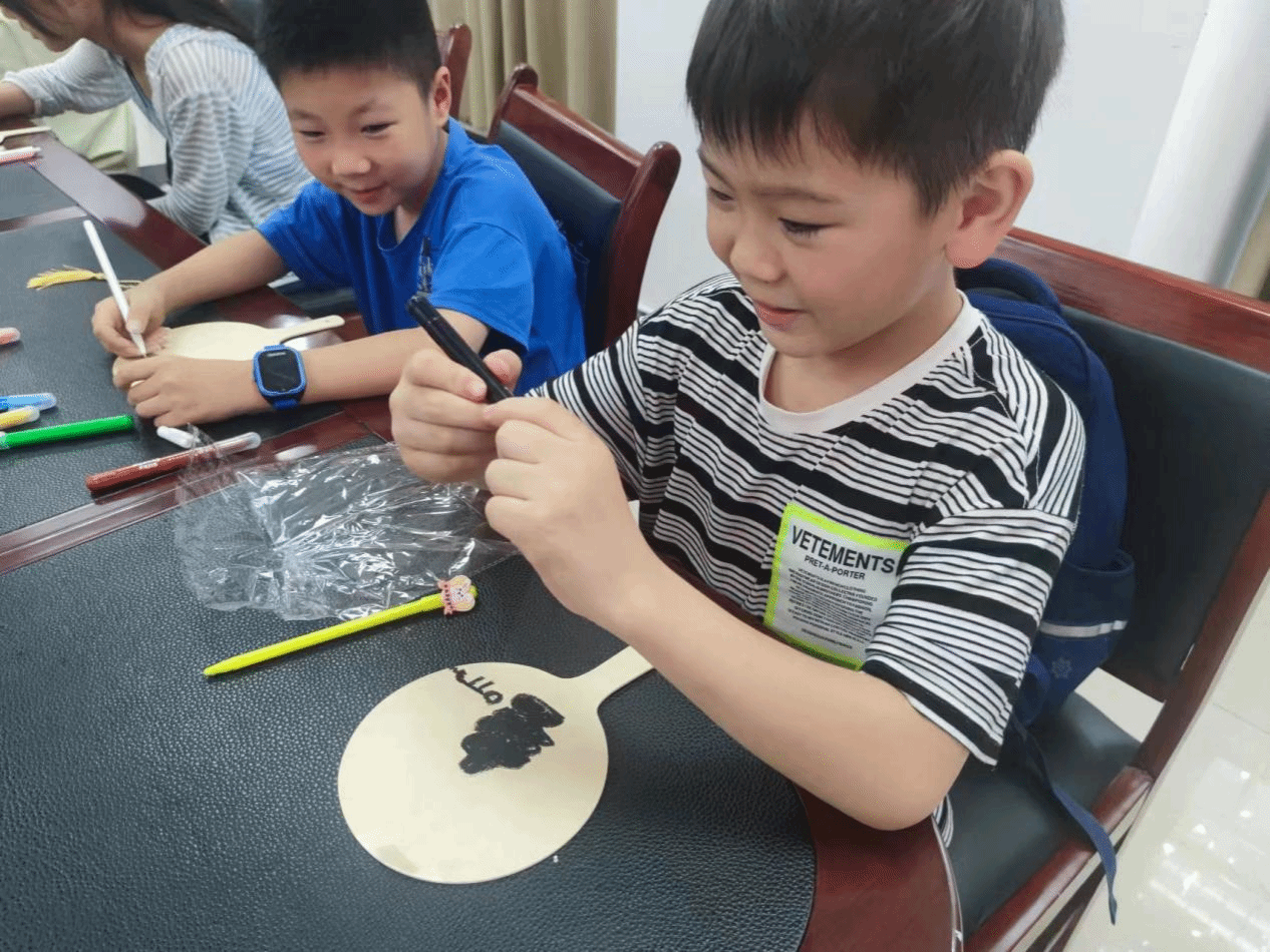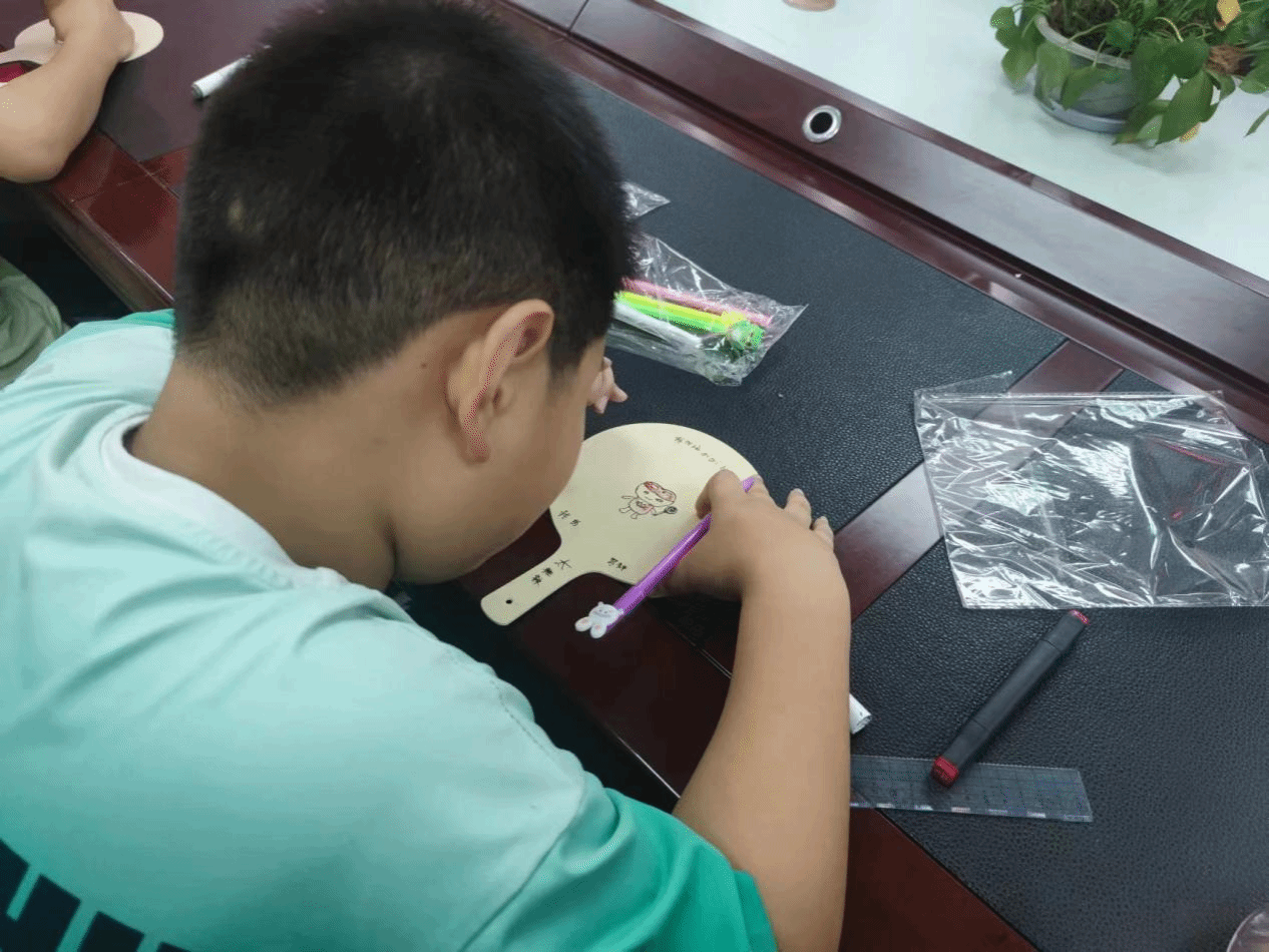 在艺术课堂上,志愿者们将没有图案色彩的团扇分发给各位小朋友,现场在志愿者的指导下充分发挥自己的想象力,大家耐心细致地进行手工制作,通过自己的双手将手中的材料变成了一个个精美的团扇。