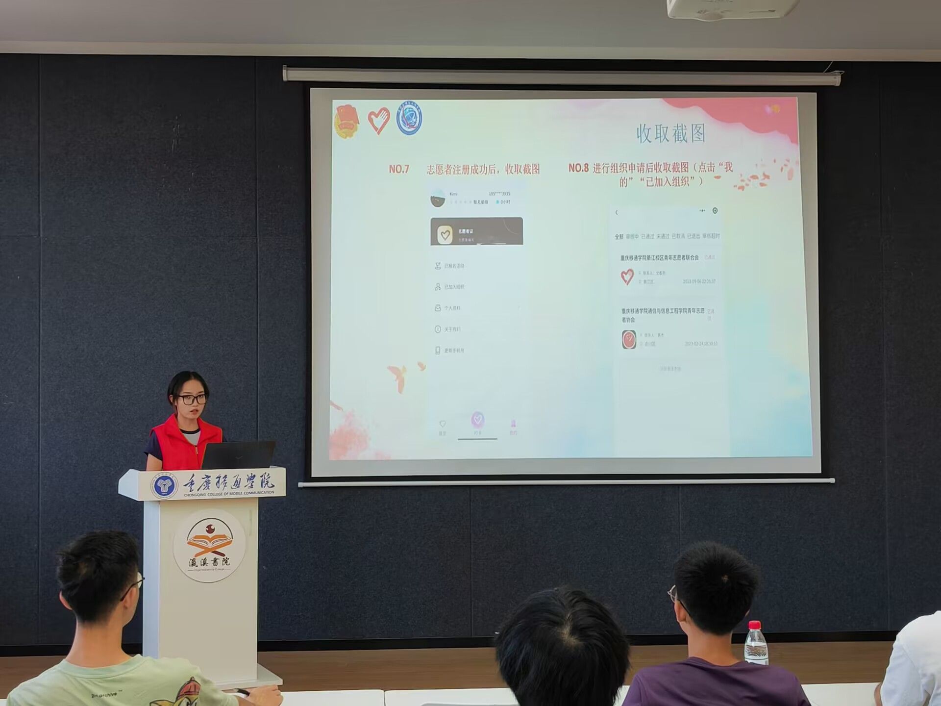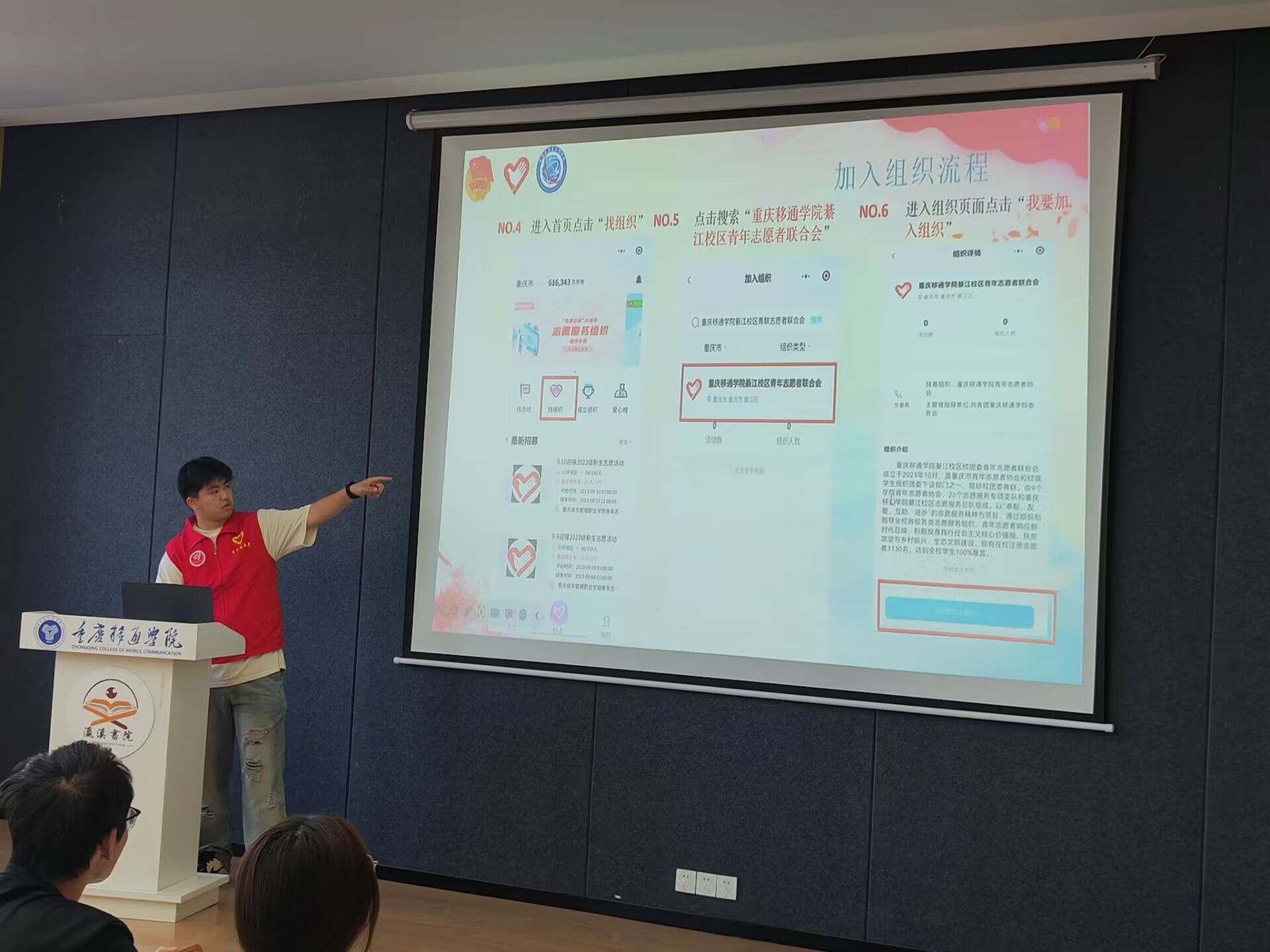 此次活动主要集中于“志愿汇”和“志愿山城”两个与志愿者相关软件的注册及使用方面展开活动。“志愿山城”是团市委指定的志愿服务信息系统,是全市各级团组织志愿服务的展示平台、交流平台和服务平台。利用“志愿山城”推动志愿力量前行是每一位移通学子热情火焰的点燃。后续,志愿者将通过该系统使用加入志愿服务组织、报名参加志愿活动、查看服务记录、打印服务证明、星级志愿者认定等功能。志愿服务组织将通过该系统开展志愿服务项目发布,志愿服务记录与证明开具等工作,组织全部同学完成“志愿者注册”和“加入组织”。在活动过程中,志愿者们多元化深刻讲解了志愿者注册及软件使用流程。对各班团干部提出的疑问也做了详细的解答并细心指导班团们完成相关注册,使活动的开展更加完善、有序。让每一位同学受益匪浅,汲取经验而不尽,让志愿活动深入每一个人的内心,积极去推动、去传播、去落实。