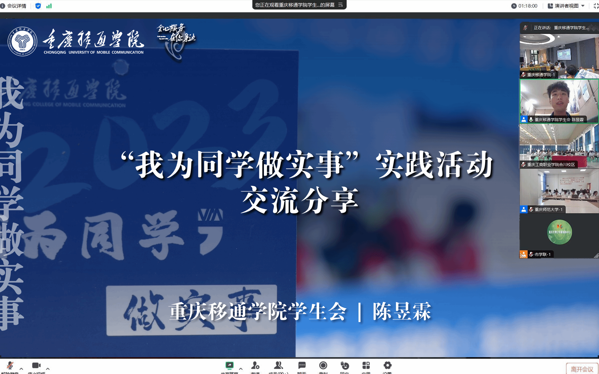 此外,我校学生会执行主席陈昱霖受邀在此次会上向全市80余所高校,8000余名学生骨干,做“我为同学做实事”实践活动交流分享。在分享中,陈昱霖同学从思想引领、服务需求、权益维护、创新创业、社团活动等五个方面出发,指出重庆移通学院学生会始终关注同学思想成长、学业发展、就业帮扶、实践活动、身心健康、困难援助、权益维护等多种需求,孵化百余个活动项目,服务同学覆盖率高、评价效果好,让“全心全意为同学服务”走进同学身边,真正成为让党放心、师生满意、社会认可、朝气蓬勃的学生组织。