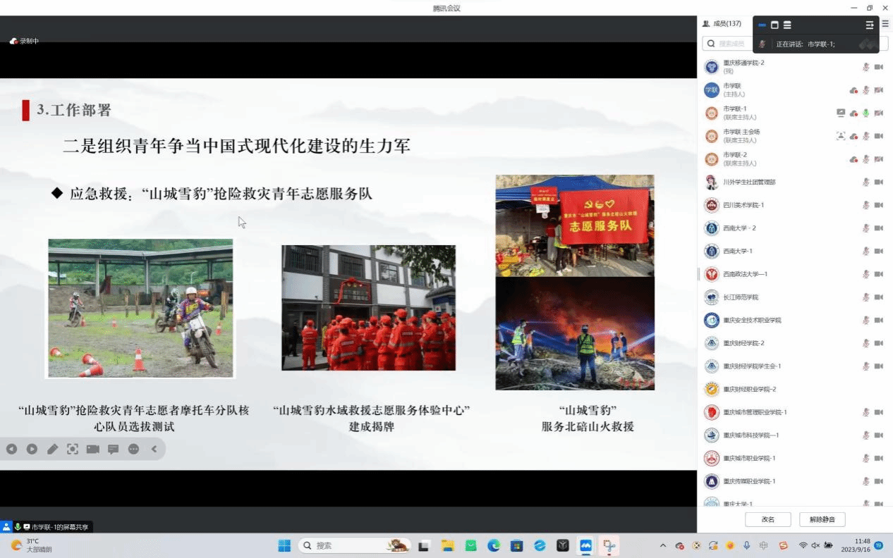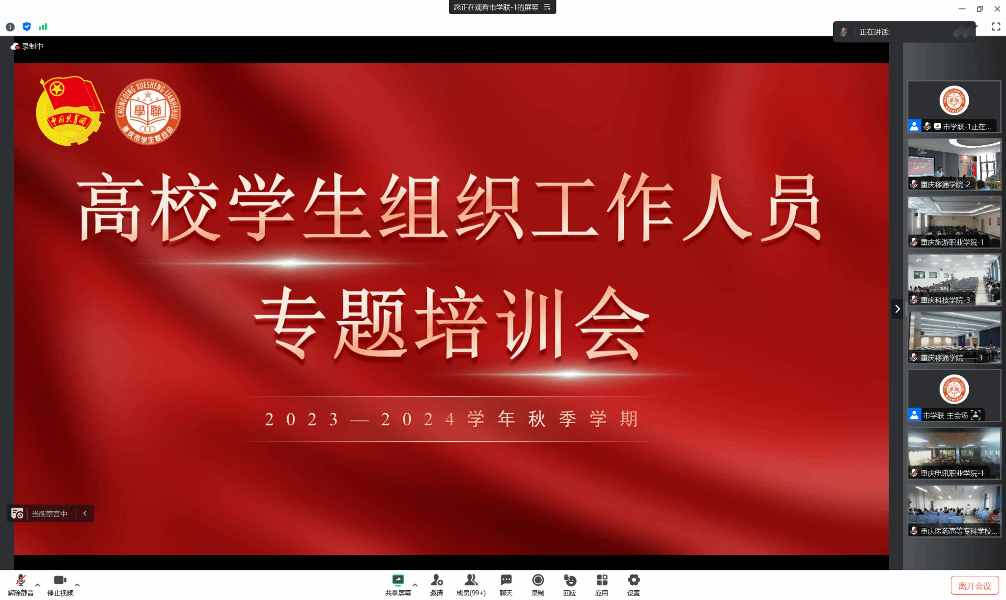 2023年9月16日上午,2023年秋季学期高校学生组织工作人员专题培训会以网络视频形式召开。重庆移通学院双校区学生会成员在南湖书院圆桌会议室、綦河书院观涛·多功能报告厅参与此次会议。