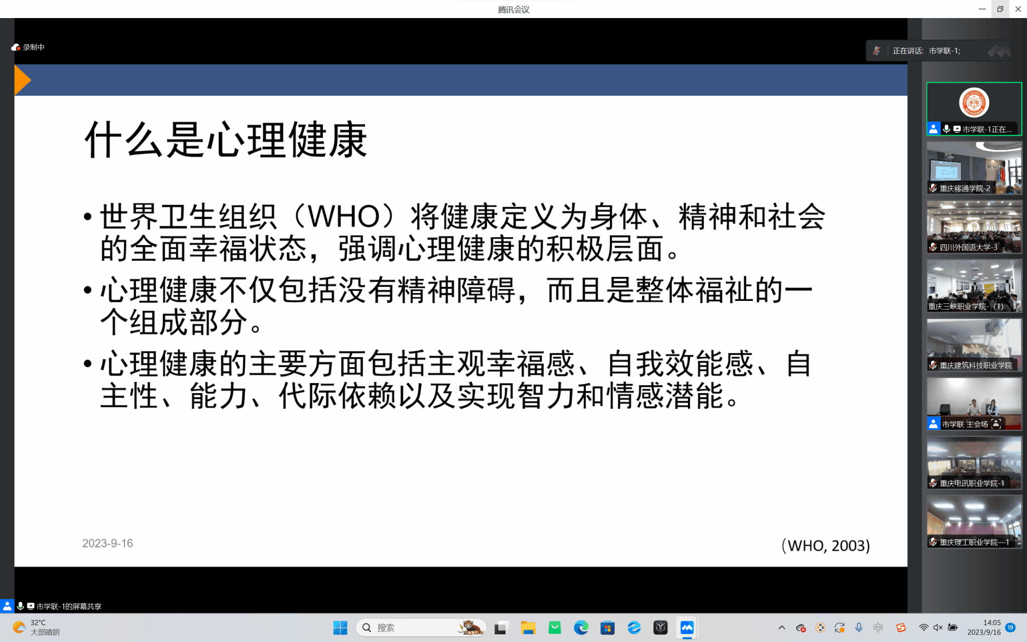 为扎实开展学习贯彻习近平新时代中国特色社会主义思想主题教育,深入学习宣传贯彻党的二十大精神,不断加强和改进新时代高校学生会工作,巩固深化学联学生会改革,持续加强学生社团建设管理,提升学生骨干的理论素养、研究能力和实践水平。重庆市学生联合会特于2023年9月16日至9月17日,举办重庆市学生联合会2023年秋季学期高校学生组织工作人员专题培训会。本次培训采用线下部分集中参会、线上录屏转播的方式进行,重庆移通学院双校区学生会全体工作人员、学生会秘书长和学生社团管理中心负责人等双校区100余名学生骨干参与本次培训。