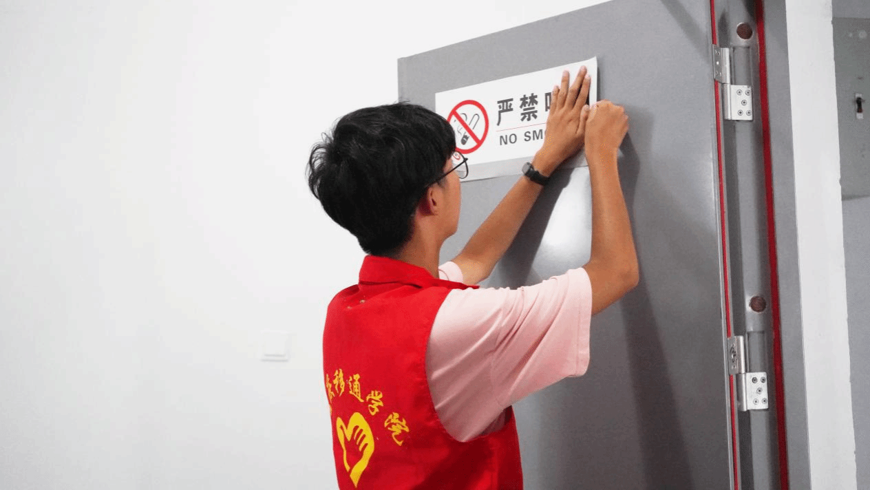 无烟校园,清新一片。艺术传媒学院青年志愿者协会的志愿者们完成了第八教学楼禁烟海报的更新,随后,身着火红色志愿服的志愿者们在第八教学楼内开展巡查劝导工作,对各楼层公共区域,如洗手间、走廊等地方进行巡查,暂未发现有人员在教学区域内吸烟,巡查发现有掉落在地上的烟头时,志愿者们主动上前清洁地面,志愿者们一鞠一躬的捡烟动作传达着对禁烟宣传活动的热情,为校园禁烟贡献着自己的一份热情与力量。珍惜生命,崇尚文明生活;热爱生命,养成良好习惯。禁烟宣传活动引导各位在校同学从自身做起,远离烟草,崇尚健康,争做校园禁烟带头人。以自身禁烟行动影响他人,形成“选择无烟青春,共建和谐校园”的高校生活理念。