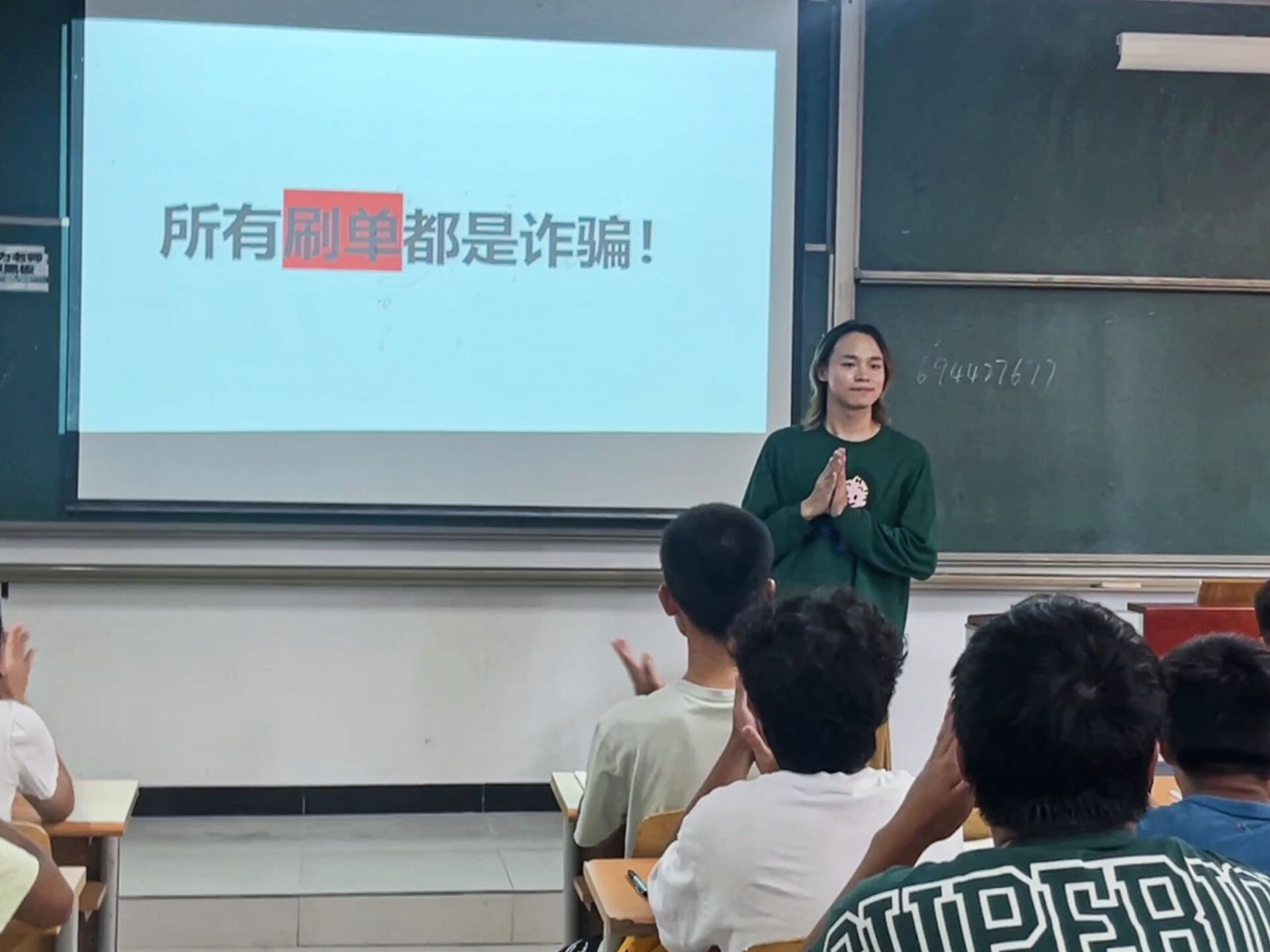 活动中期,黄一老师于9月15日对新生开展反诈宣传活动,通过举例说明的方式剖析学生群体易遭遇的刷单兼职诈骗、冒充客服诈骗、买卖游戏装备等诈骗套路并讲述买卖手机卡、QQ号等的危害和后果,提醒学生不要为了蝇头小利出租电话卡,成为电信网络诈骗的帮凶。此外,还从消防、意外事件、寝室矛盾、心理健康等方面对学生做提醒以及这些问题发生时的应对措施。此次活动提高了学生的防骗意识,进一步筑牢校园安全防线。