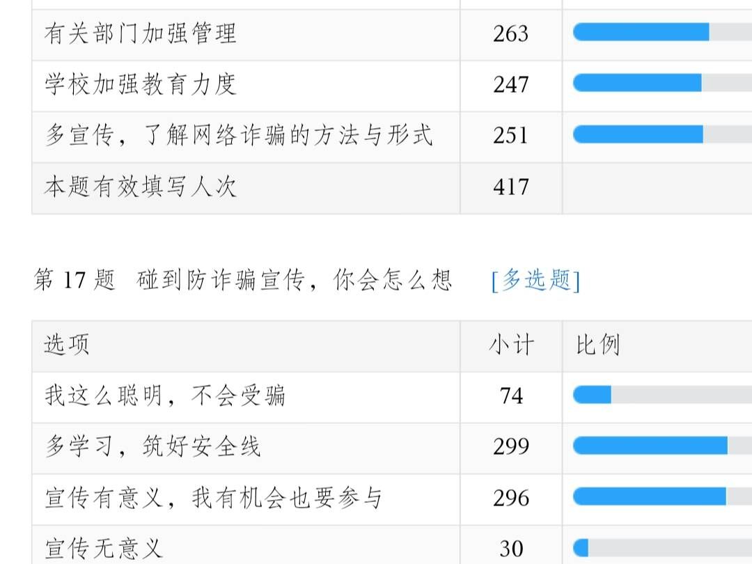 活动前期,智能工程学院对于开学季前来报到的新生,进行反诈宣传问卷的调查。调查问卷直观全面地反映学生的反诈防骗意识,积极宣传防范电信网络诈骗知识。学生通过此种方式,正确认识各种诈骗形式的危害信、提高个人风险意识并强化自我保护意识,此次问卷调查,取得了明显成效,为反诈的星火燎原助力。