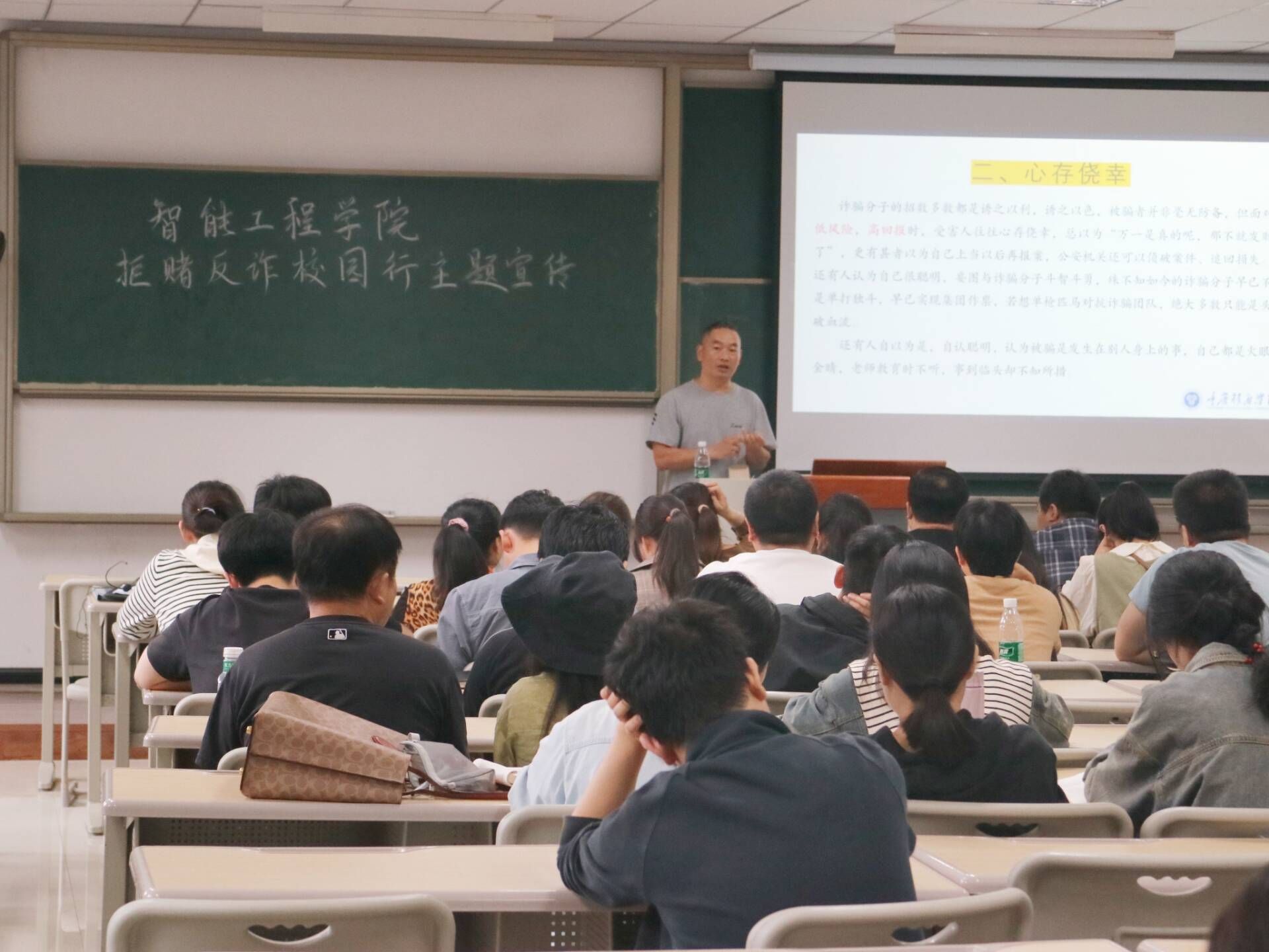 活动后期,智能工程学院于9月27日在9201教室进行“拒赌反诈校园行”主题宣讲会。本次宣讲会,主要由学校保安处处长彭洪为学院老师讲授反诈防骗知识。彭处长首先用直观的数据为老师们展示了学校近三年电信网络诈骗的发案情况;紧接着,向老师们普及各种形式的诈骗手段,并且重点强调刷单返利这一频发的案例;然后又从被害人的角度深入分析被诈骗的原因,并且提出很多预防诈骗的方法和补救措施;最后,彭处长积极呼吁大家下载重庆市合川区反诈骗中心app,带着大家朝着预防诈骗这一目标前行。宣讲会最后,祝玮副院长带领全体老师宣读《拒赌反诈倡议书》并签订《反诈专项行动责任状》,老师们积极参与到反诈防骗活动中,提高自身反诈意识的同时也宣传呼吁更多的人加入其中,为创建安全和谐校园贡献力量。