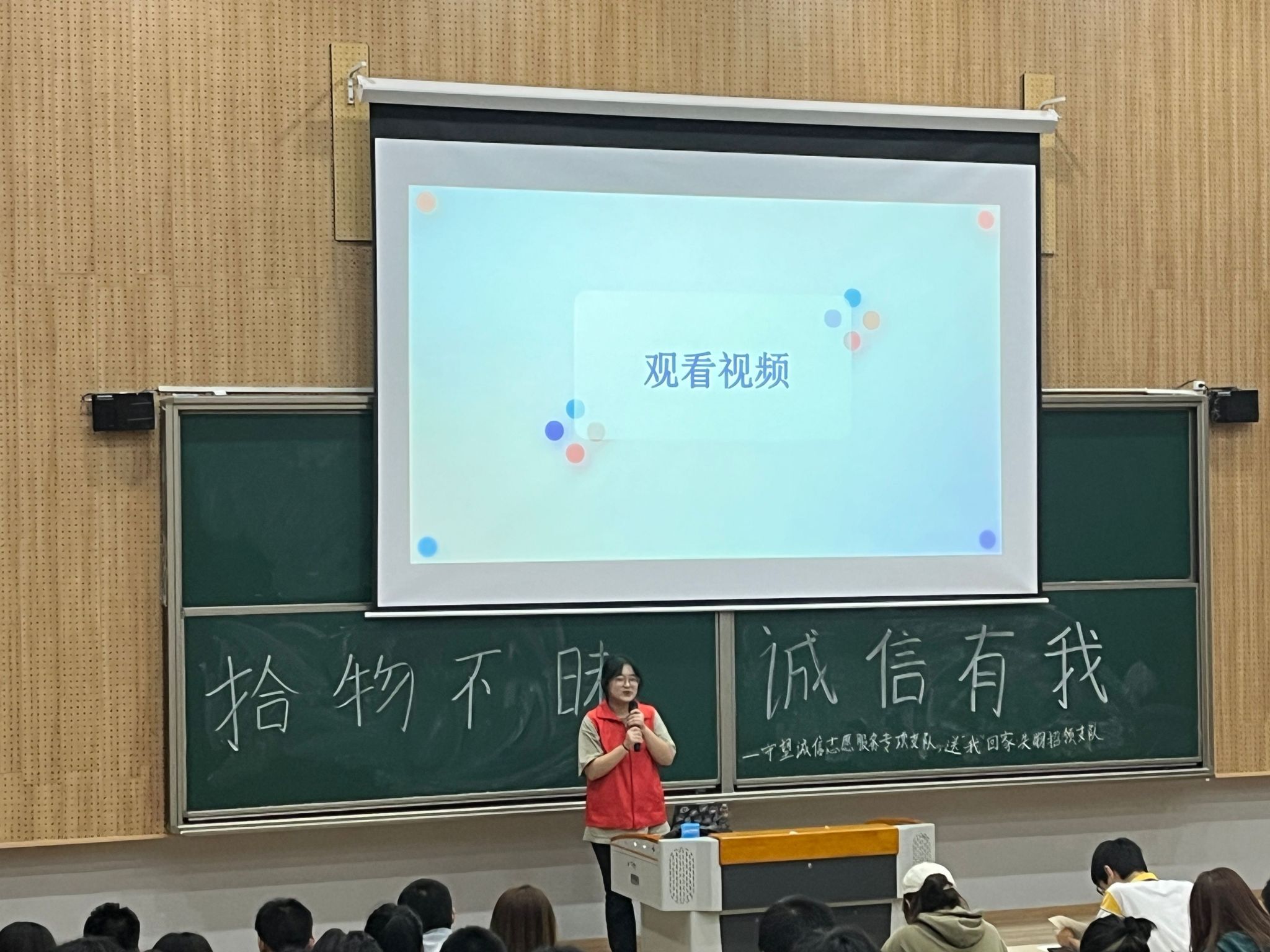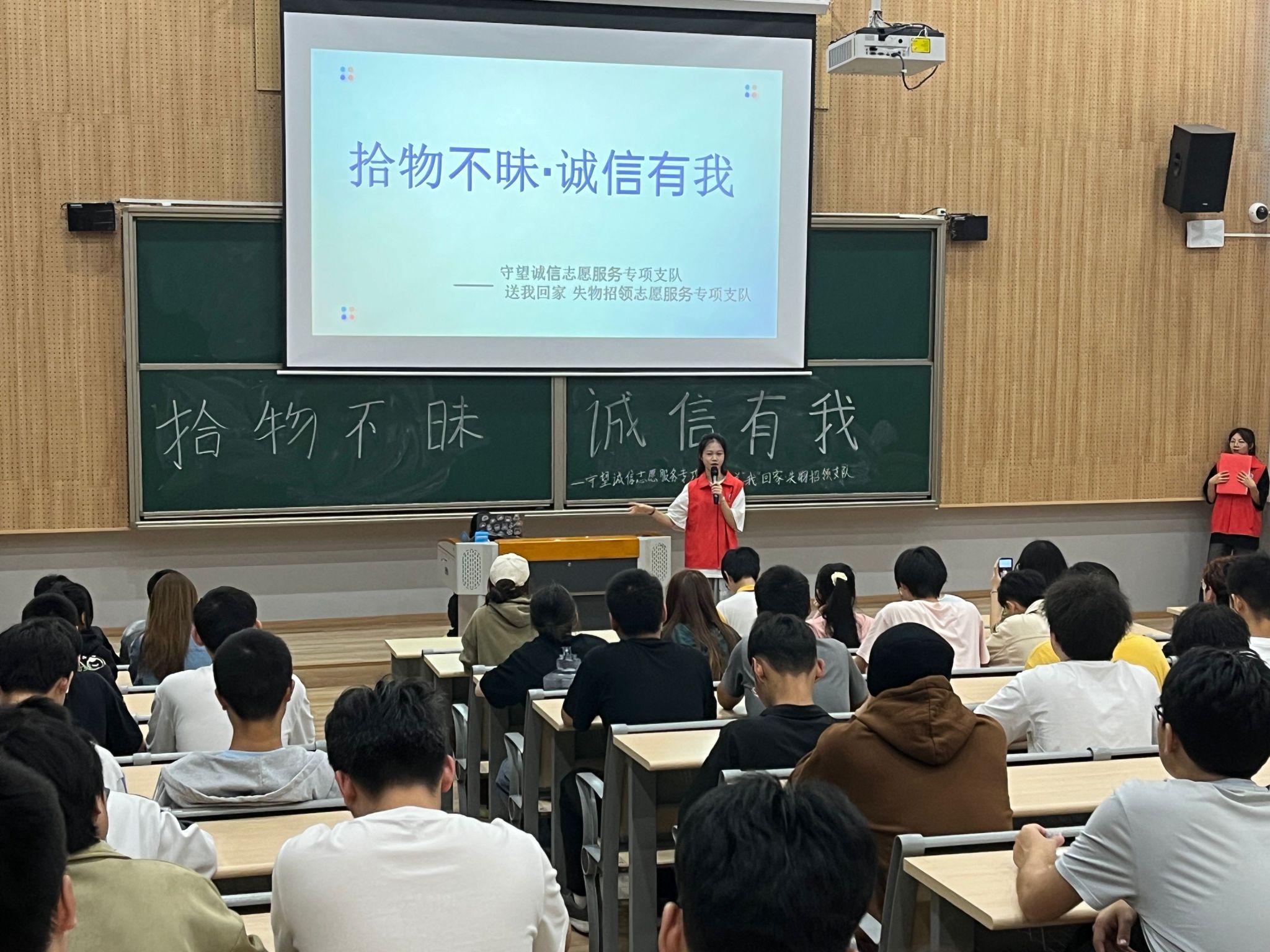 诚信是社会的基石,是人际交往关系的基础。为了引导大学生树立正确的诚信观念,加强诚信教育,顺应我校对学生的培养理念。2023年9月27日大数据学院的守望诚信志愿服务专项支队与送“我”回家失物招领志愿服务专项支队,携手在横山书院阶梯教室开展了主题为“拾物不昧,诚信有我”主题联合宣讲会。