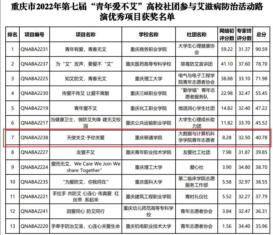 2022年10月,重庆市教委、重庆市卫健委联合印发了《2022年“青年爱不艾”高校社团参与艾滋病防治宣教活动方案》,大数据学院青年志愿者协会、天使关“艾”志愿服务专项支队积极组织申报,精心组织策划,以完满教育“第二课堂”为关键抓手,在校内外开展丰富多元的艾滋病防治宣教活动,通过多形式、多途径,广泛地开展艾滋病防治宣传教育,切实加强高校艾滋病防控工作,维护学生身心健康。