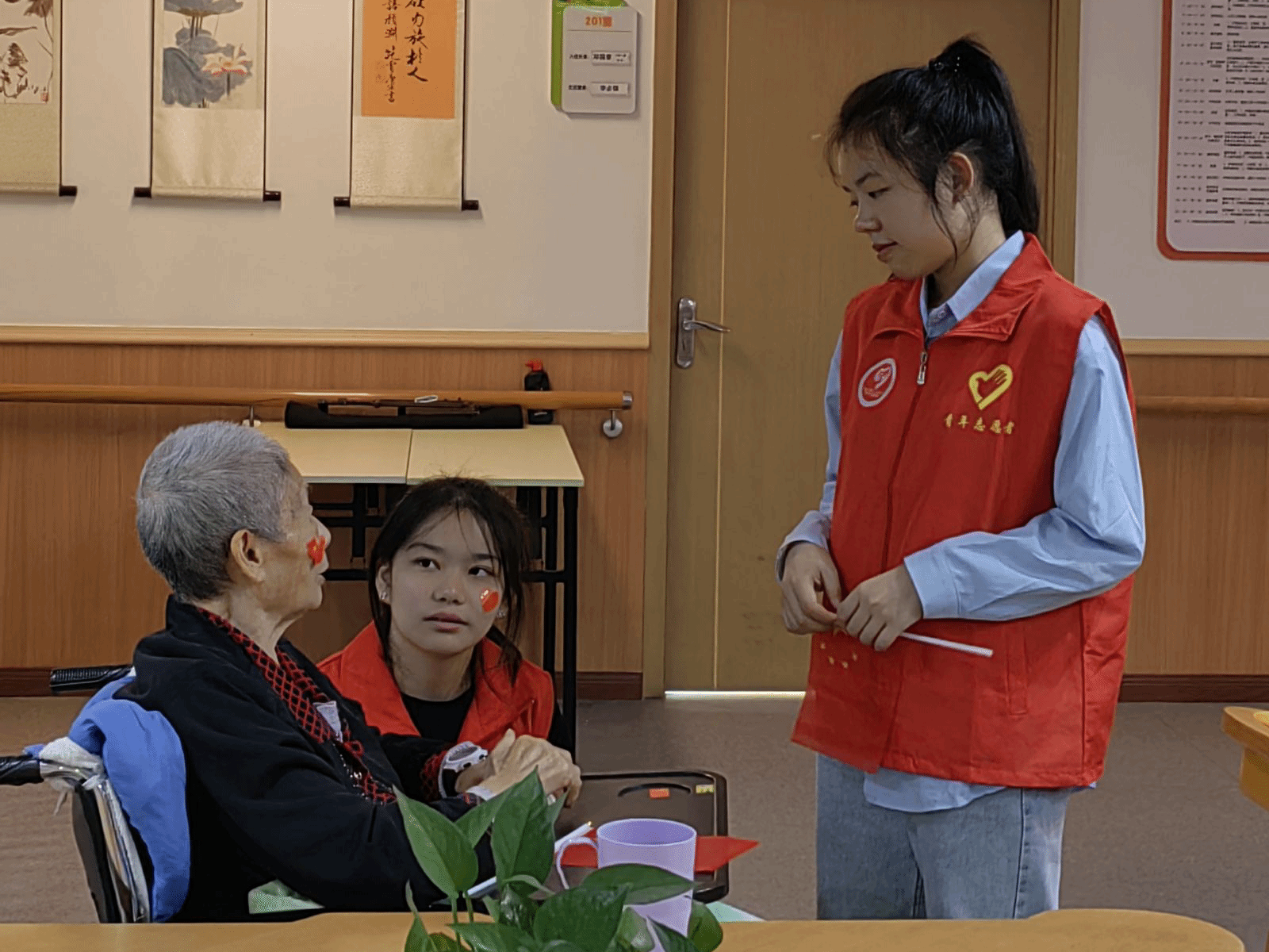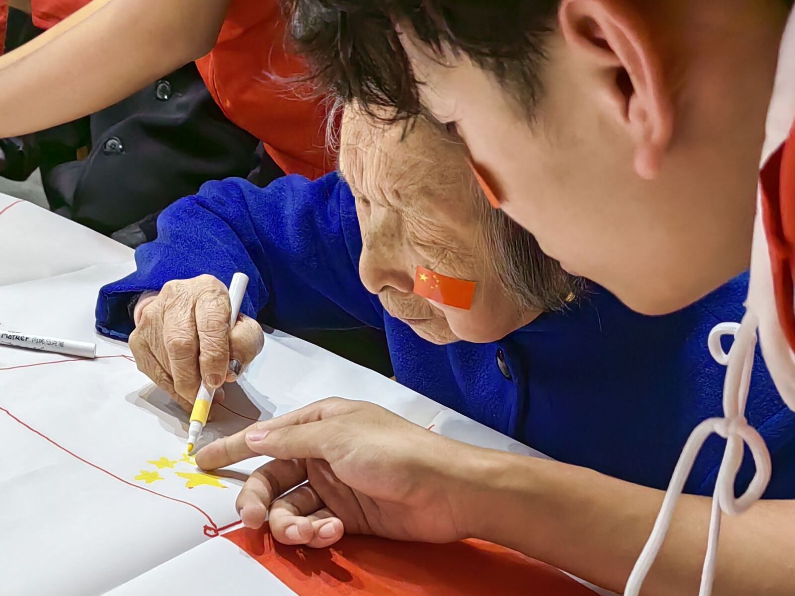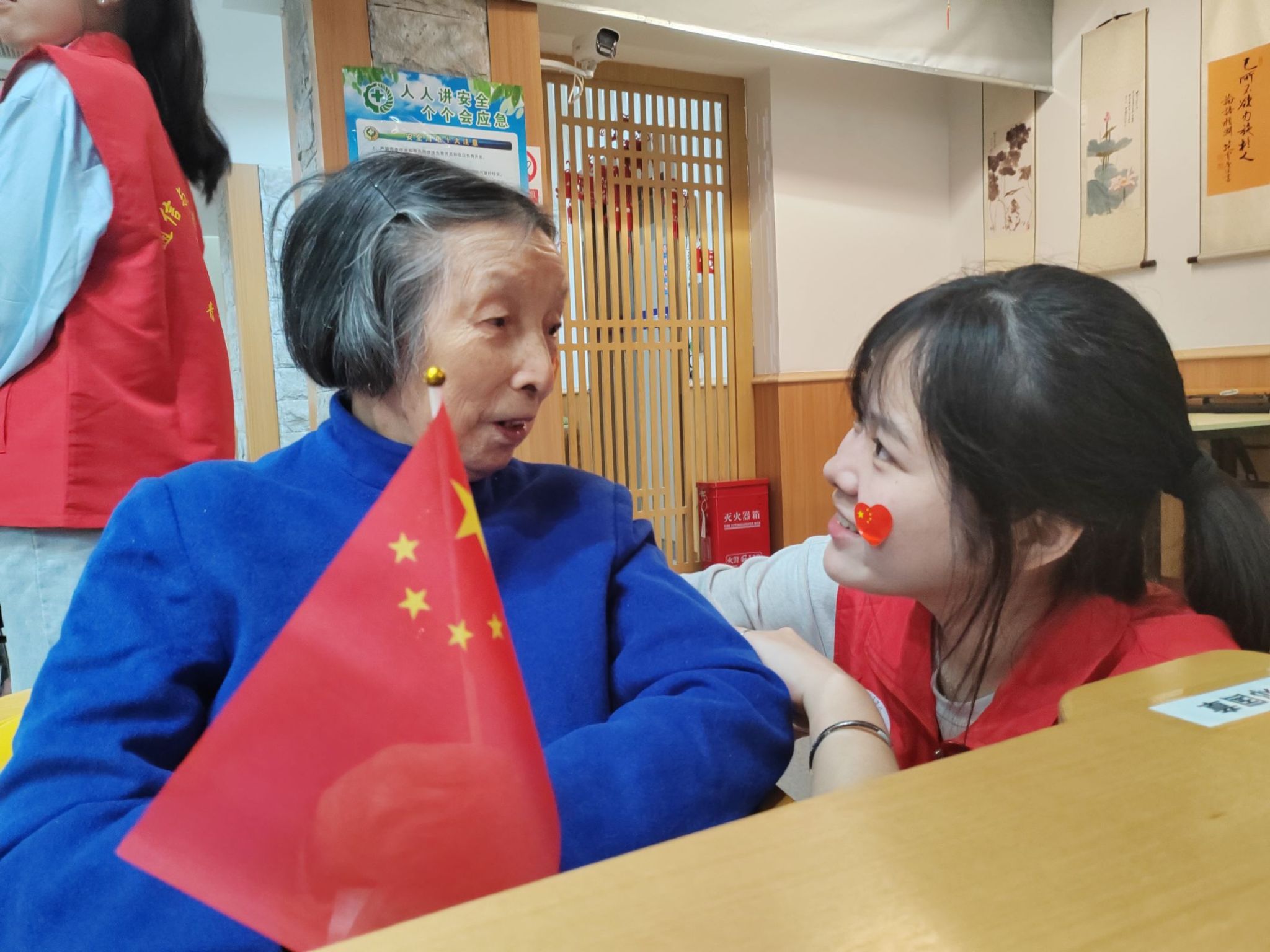老人们挥动着志愿者们送去的小红旗,高声齐唱《五星红旗,迎风飘扬》。手中的五星红旗是那么温暖,心中的爱国信念与骄傲自豪在此刻迸发,如一股股暖流涌上每个人的心头。