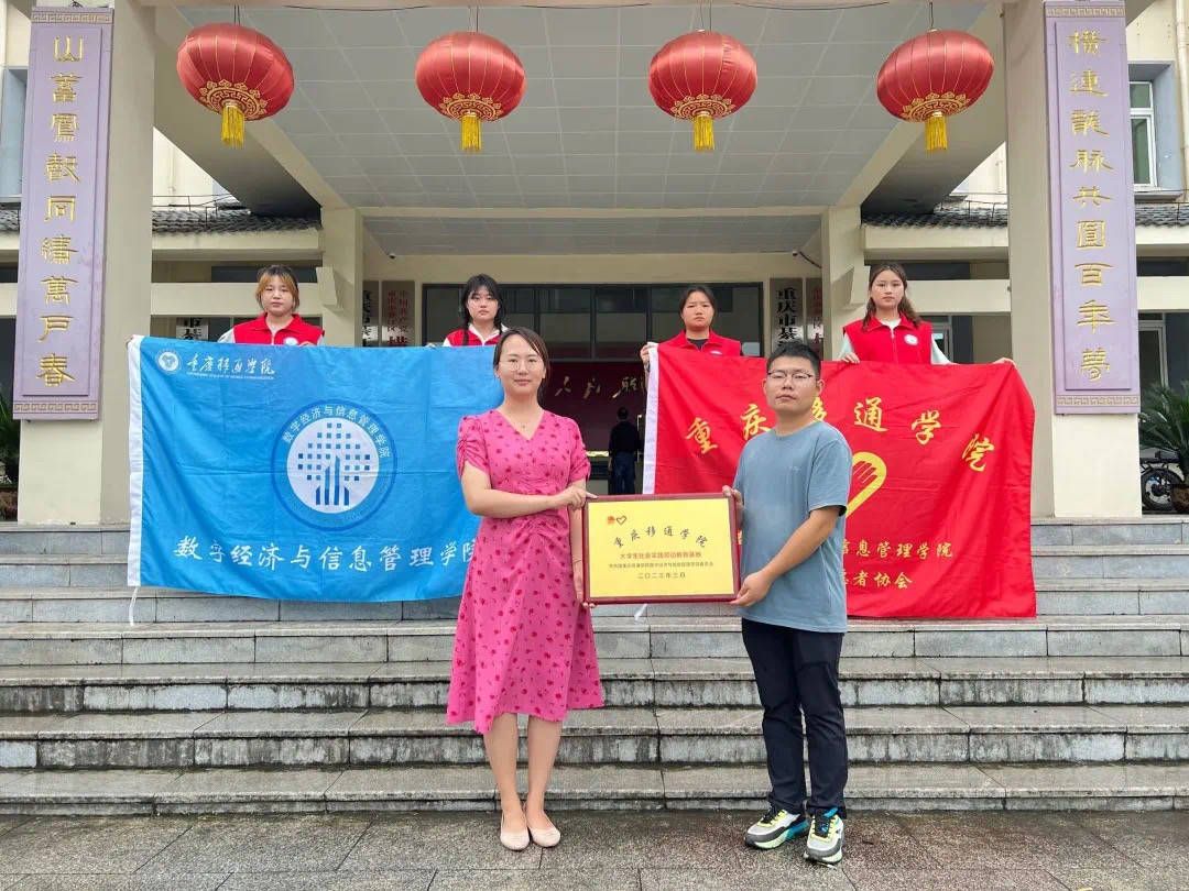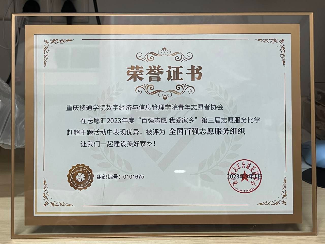 在平常的一天,数信青协收到了一个不同寻常的快递,来自志愿汇官方。拆开快递,映入眼帘的是一张荣誉奖状——重庆移通学院数字经济与信息管理学院青年志愿者协会在志愿汇2023年度“百强志愿 我爱家乡”第三届志愿服务比学赶超主题活动中表现优异,被评为全国百强志愿服务组织。