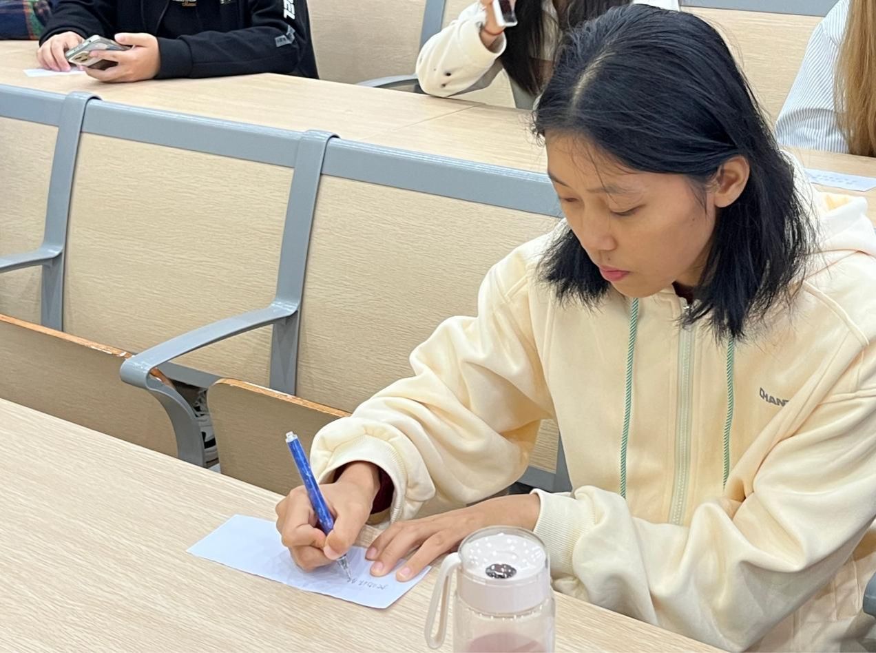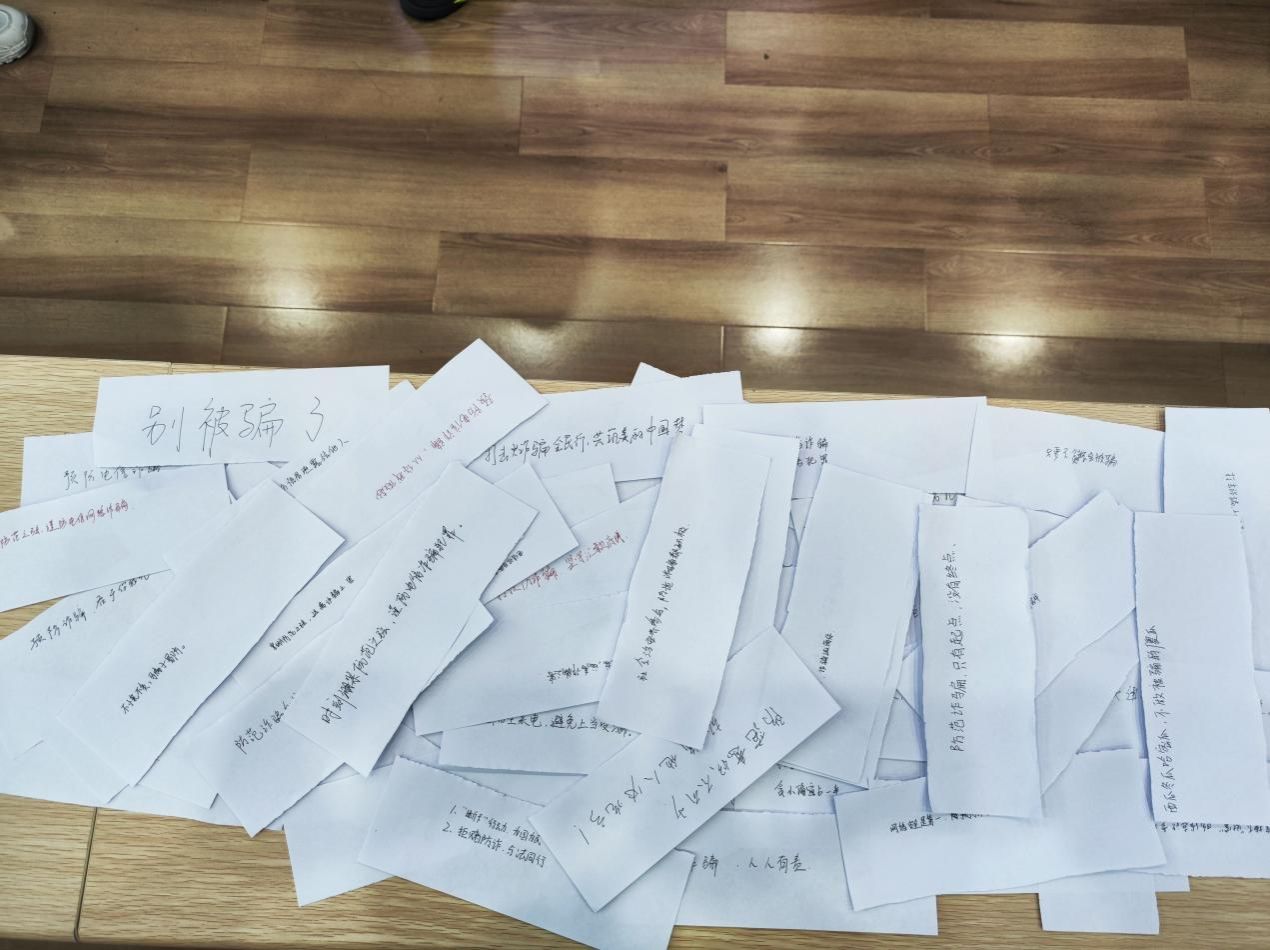 最后主讲人通过向同学们分享了一则由公安机关发布的视频以及几道反诈骗的题,告诫各位参与的同学要时刻保持高度警惕、切勿轻易相信他人、不随意理会未知的电话短信、不轻易泄露个人及家庭关键的信息,吸取经验教训,努力识别各种骗局。同时也呼吁大家下载国家反诈app,以预防诈骗的发生。在活动最后,参与的同学都写出了一则防诈骗标语,提醒各位同学谨防各类诈骗,保护自身及财产安全。